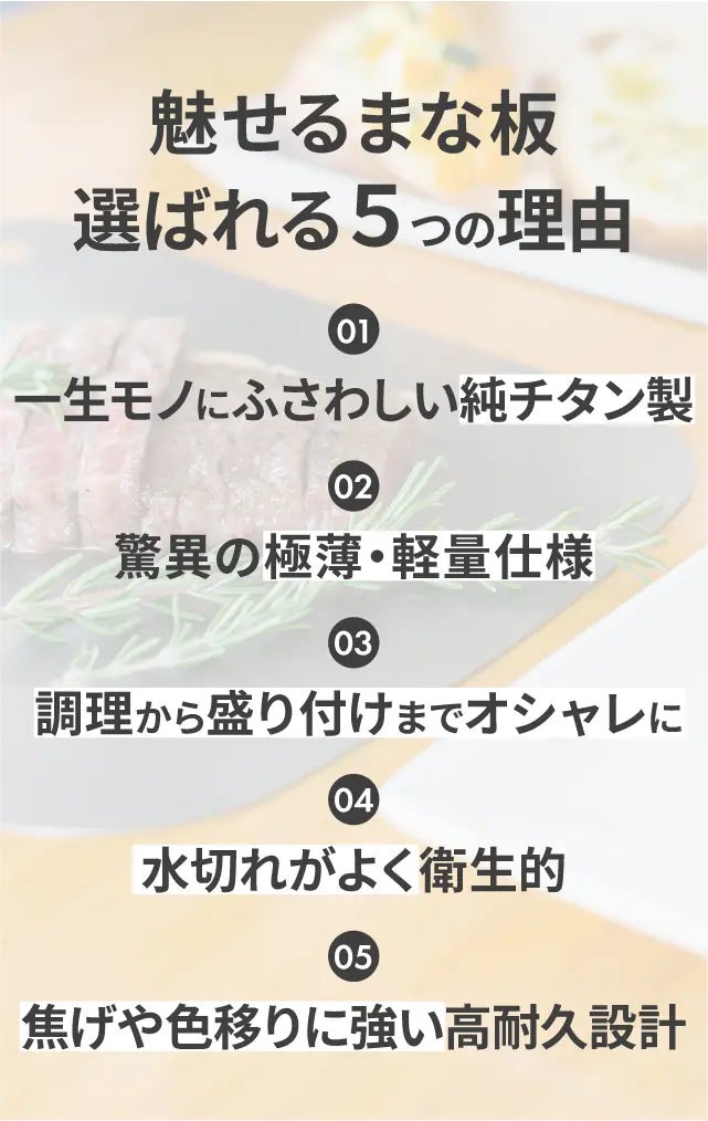 ウッドプレートは何度も使うと、色や臭い移りが避けられません。また、プラスチックのまな板では、そのまま食卓に出すことはデザインの面で難しい。純チタン製の「魅せるまな板」はそれらの問題を解決しています。