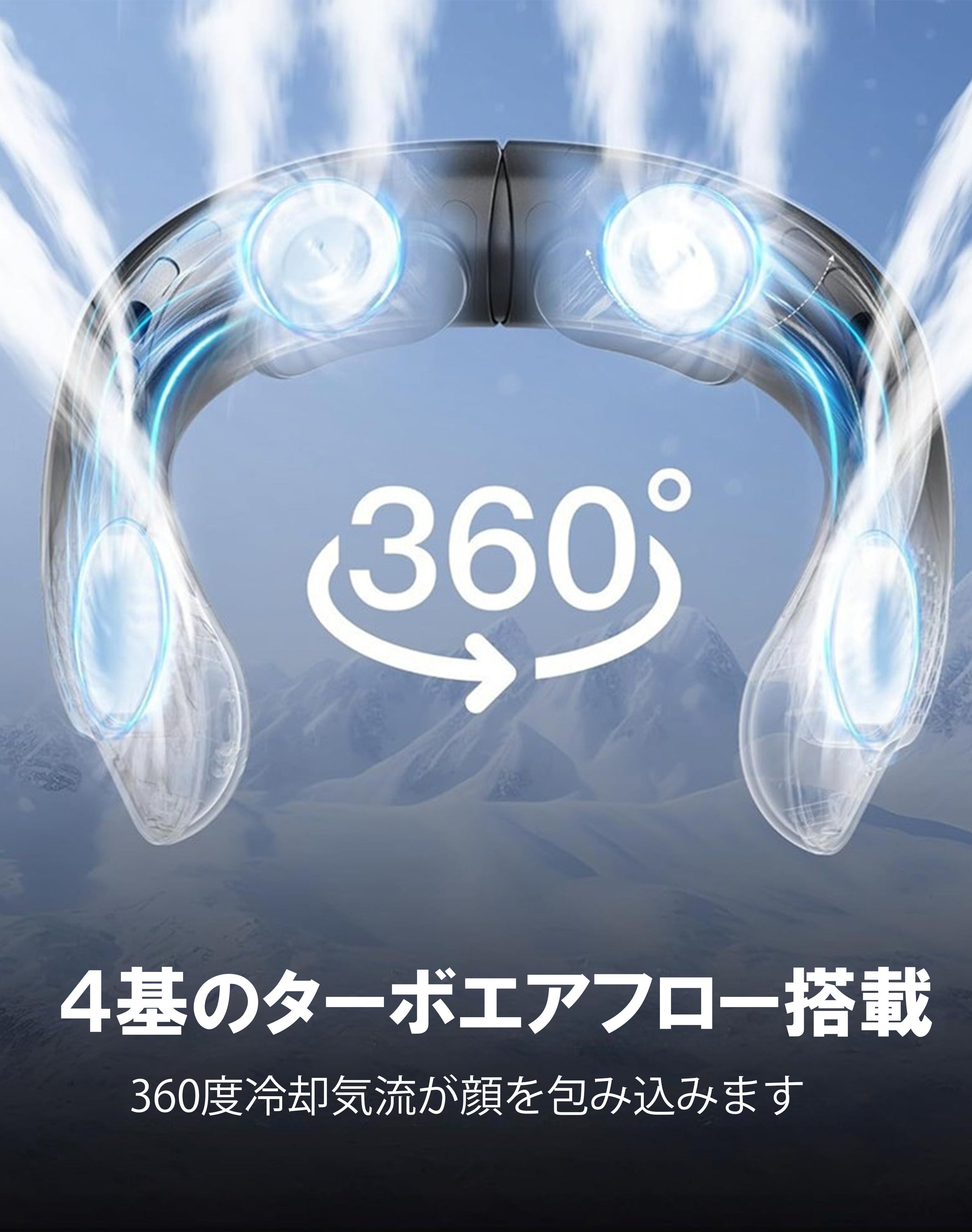 360度冷却気流 × 4基のターボエアフローで、首元を包み込むように一気にクールダウン。