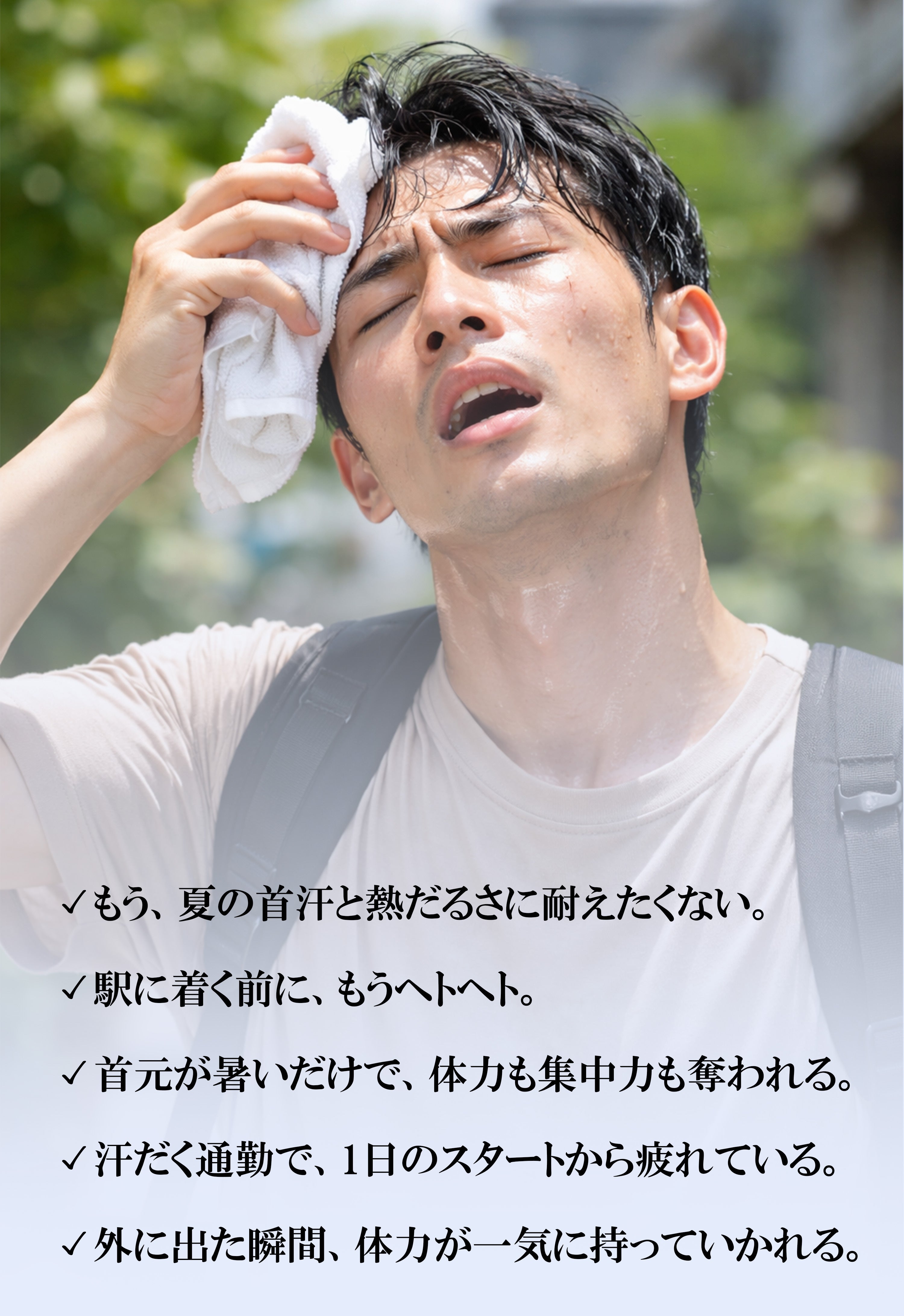 駅に着く前にはすでにヘトヘトで、外に出た瞬間から体力が一気に持っていかれる――そんな毎日に疲れていませんか?首元が暑いだけで汗は止まらず、体力だけでなく集中力まで奪われてしまう。汗だく通勤で、1日のスタートからすでに消耗してしまう夏を、もう繰り返したくない。