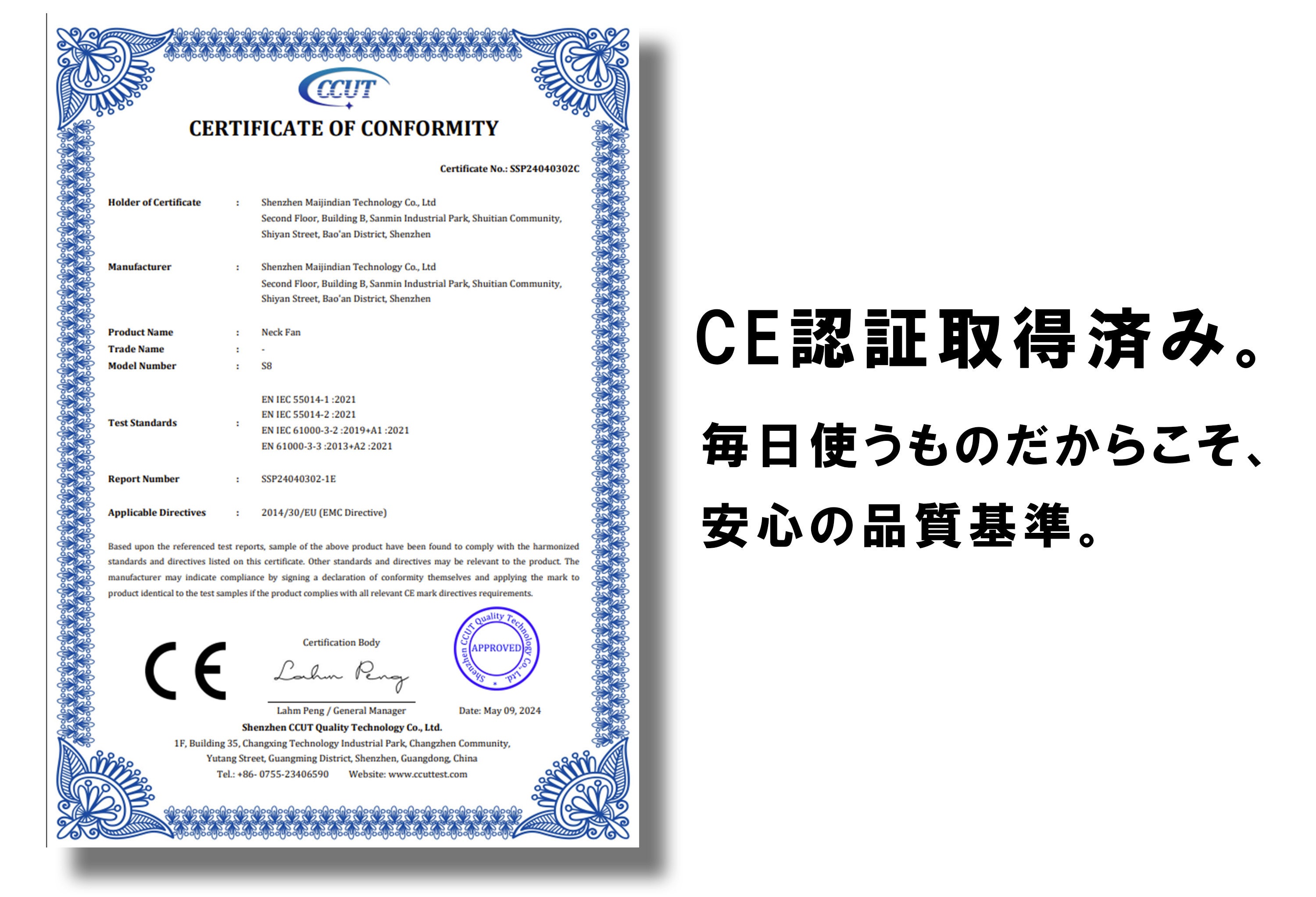NECK ZEROは、欧州の安全・品質基準に適合した製品に付与されるCE認証を取得済み。電気製品として求められる一定の安全性や品質基準をクリアしているため、毎日首元で使う冷却ファンだからこそ、より安心してお使いいただけます。