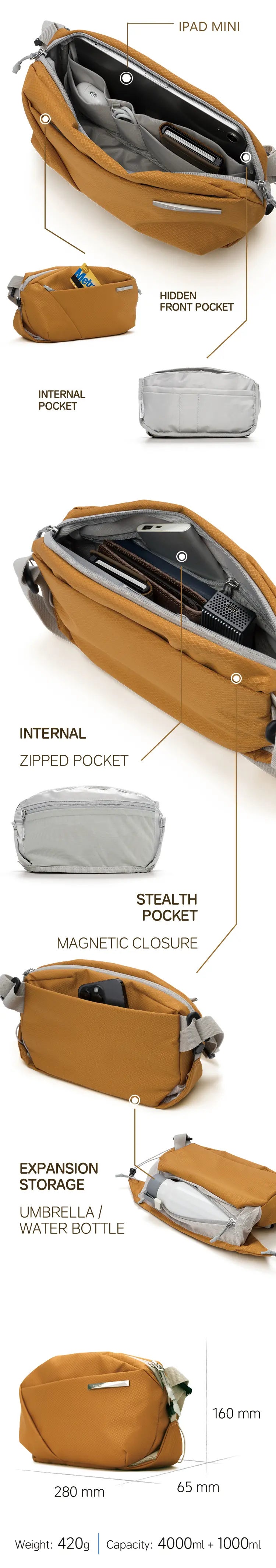 見た目以上の収納力。ボトルも傘も、魔法のように隠せる高機能バッグをコンセプトするNEO Nomad Sling。その収納力、機能性を一つづつ説明していきます。
