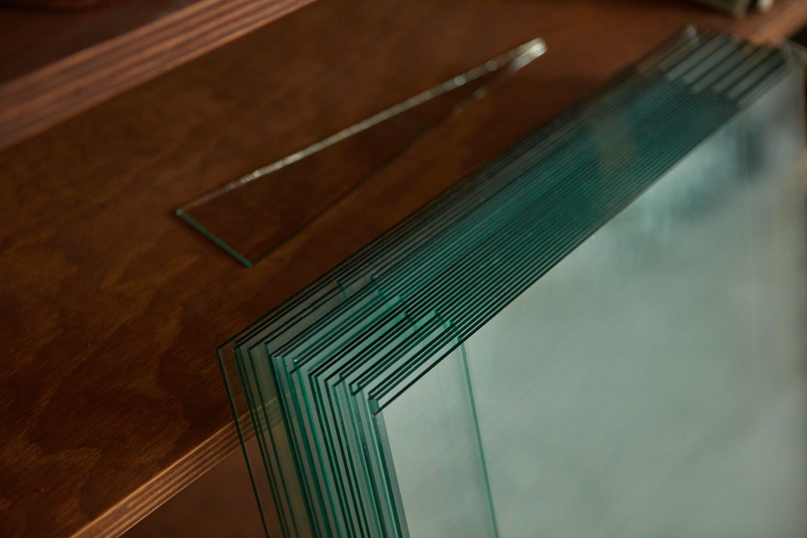 180x90cmのガラスを仕入れ、50x60cmにカットしていきます。180x90cmから3枚の50x60cmと9枚の25x30cmとちょっとあまり。