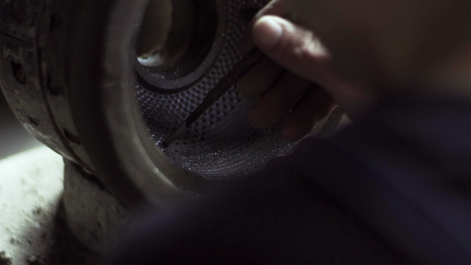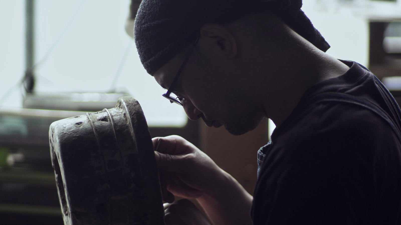 鋳型を作っているところ。窓から入ってくる横からの光で、凹凸を確認していく。