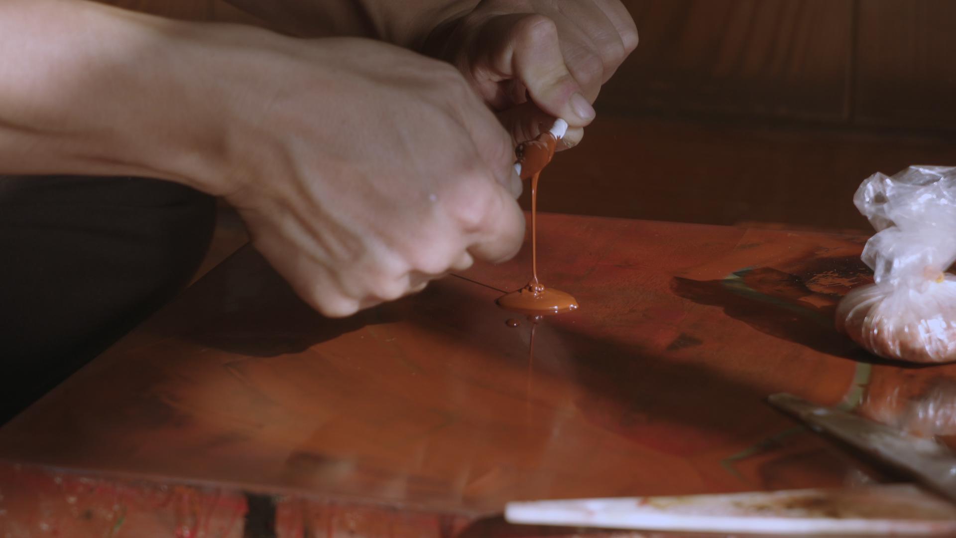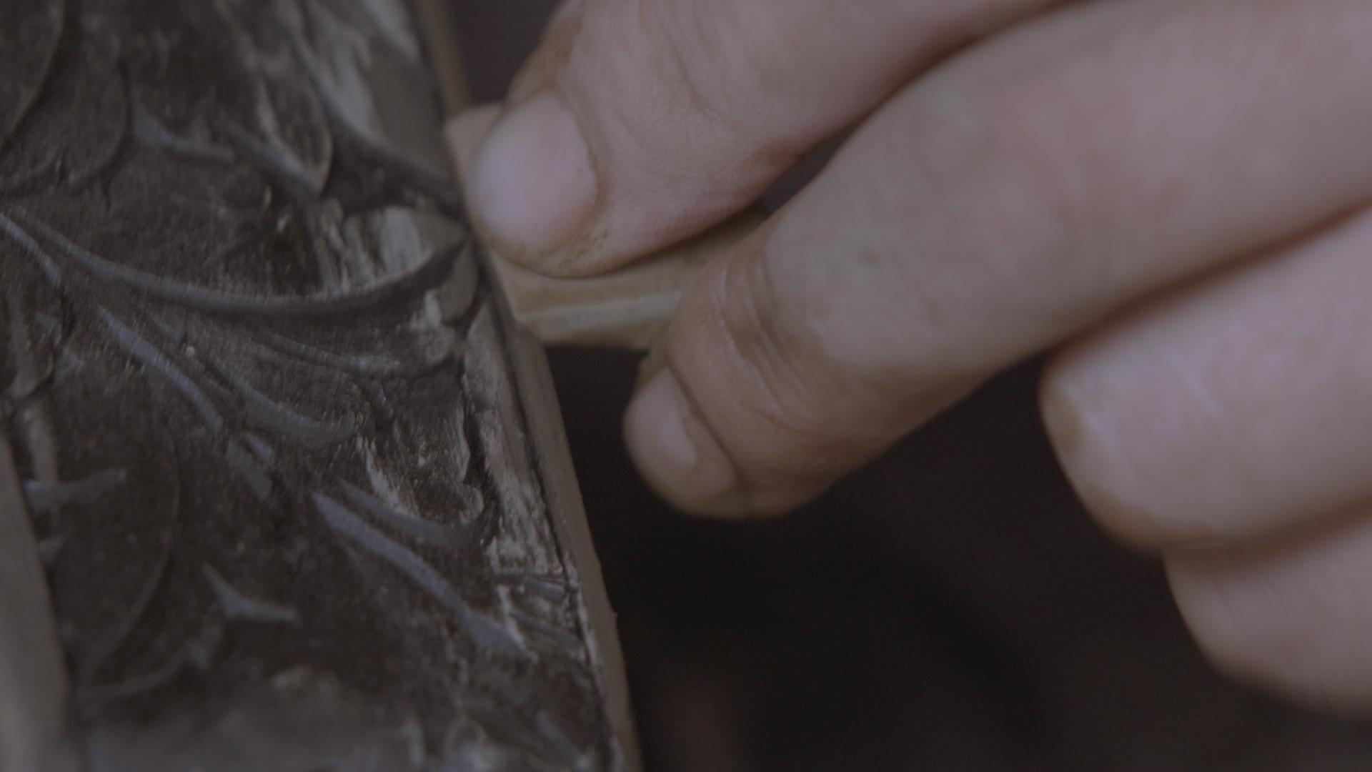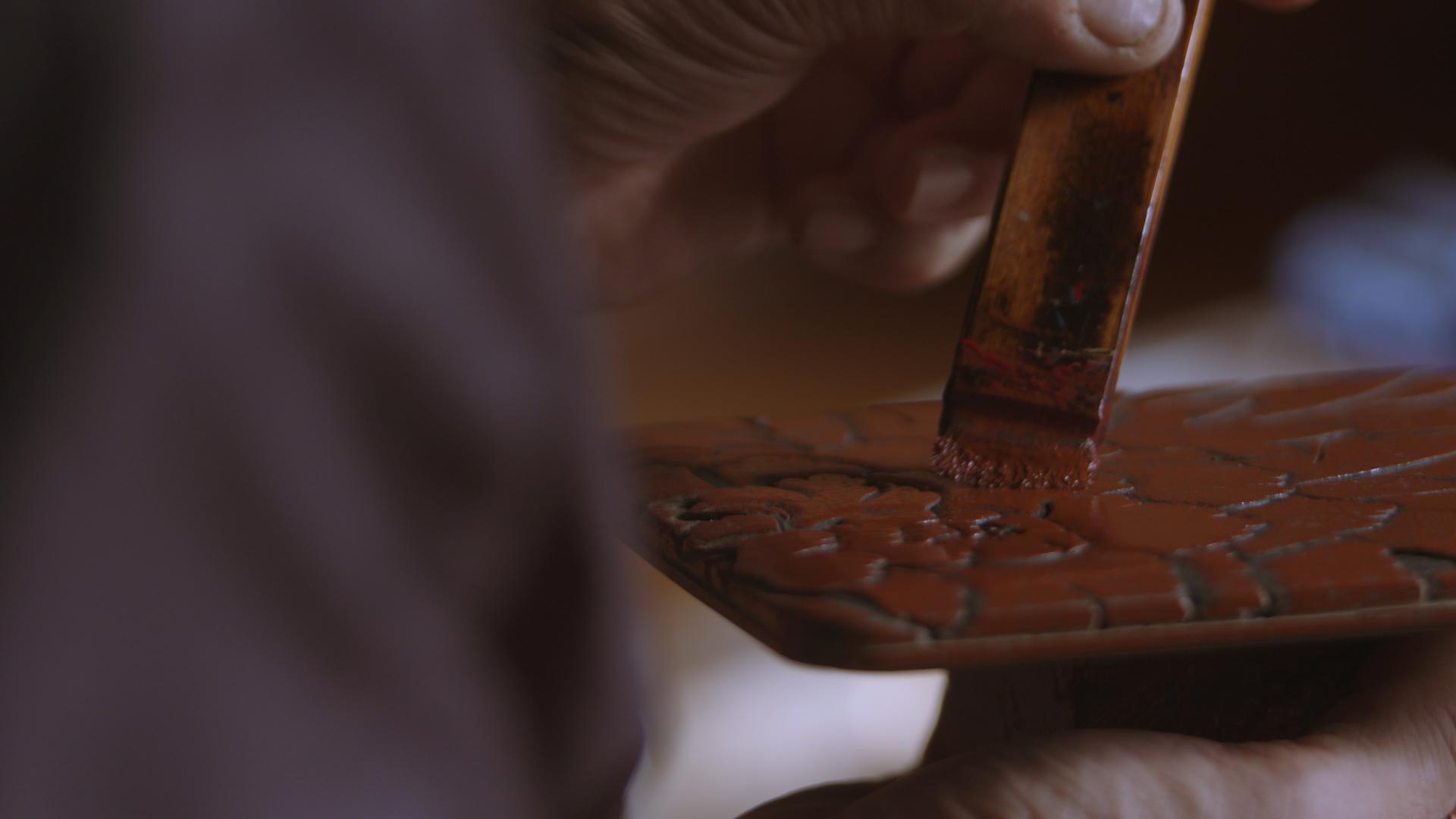 彫りの溝に漆が入り込まないように塗っていきます。