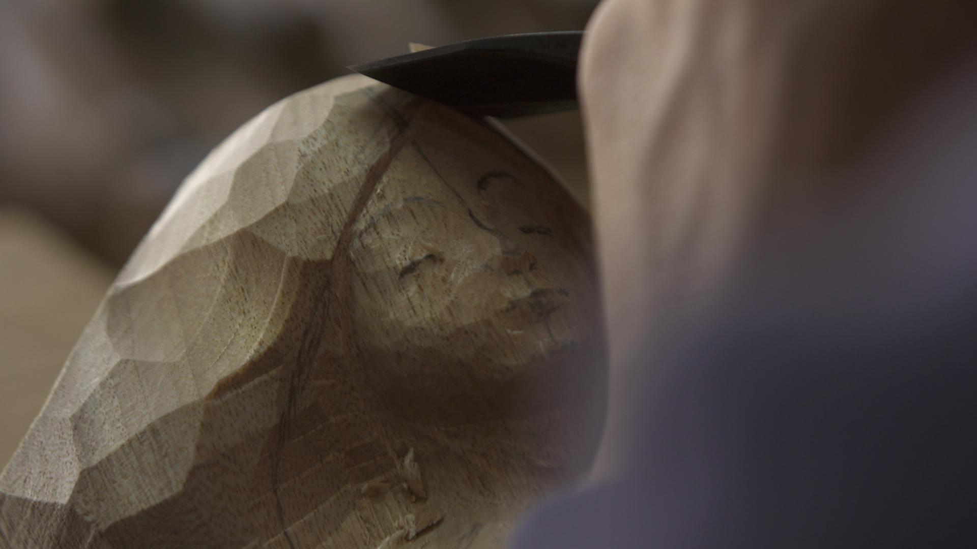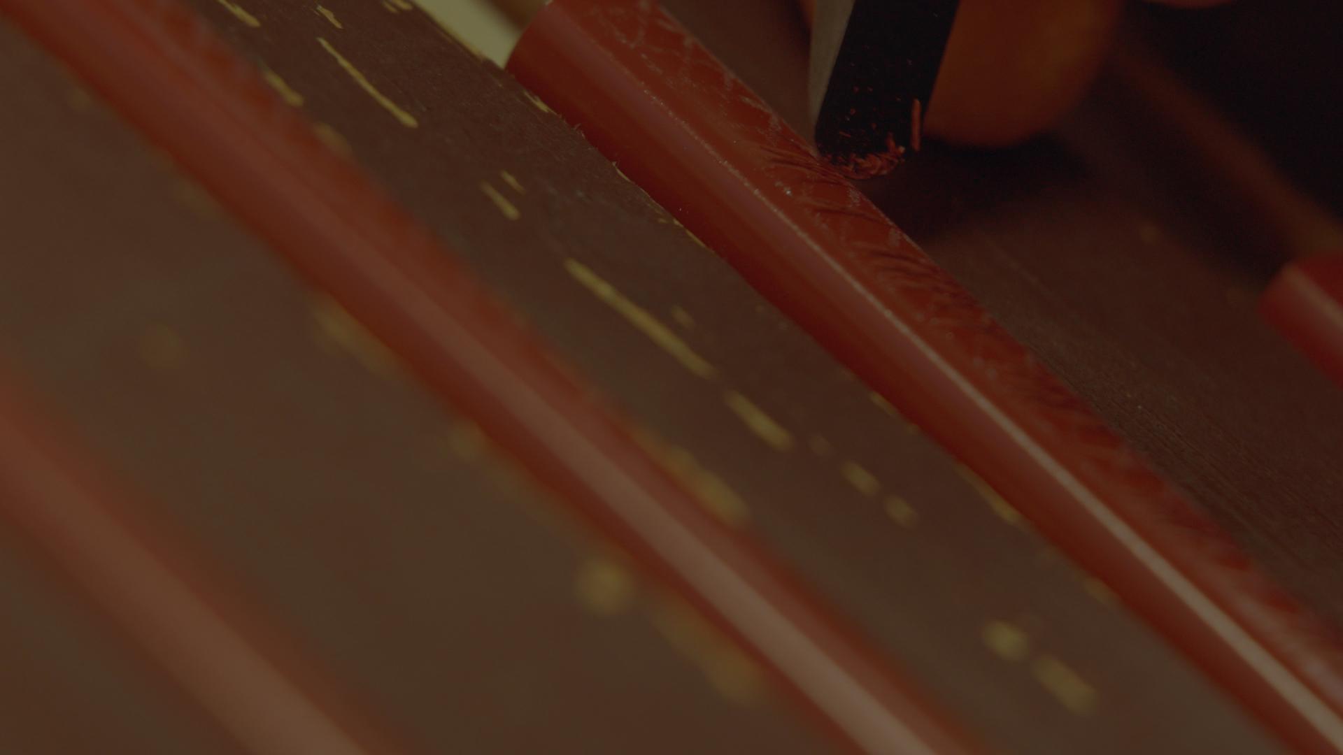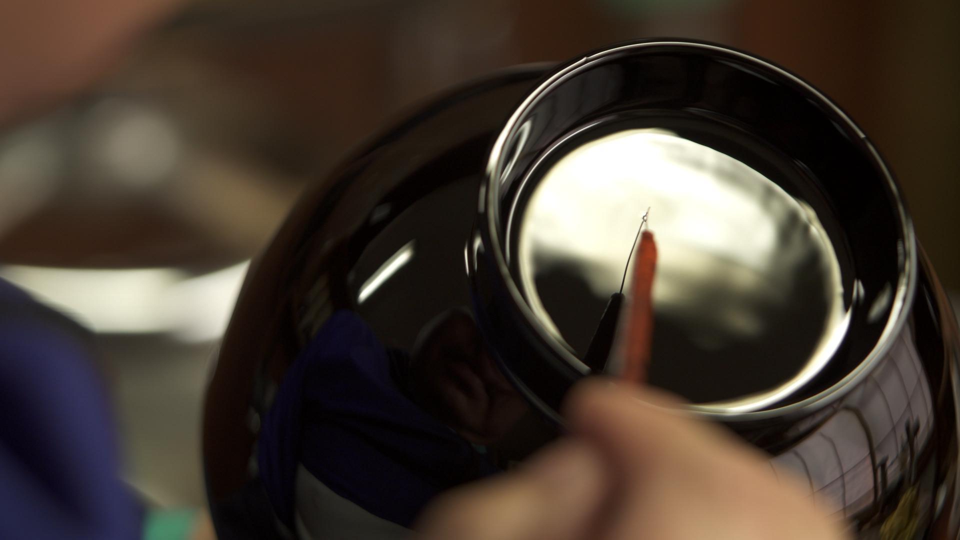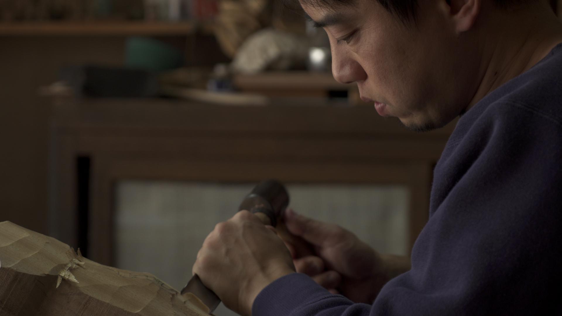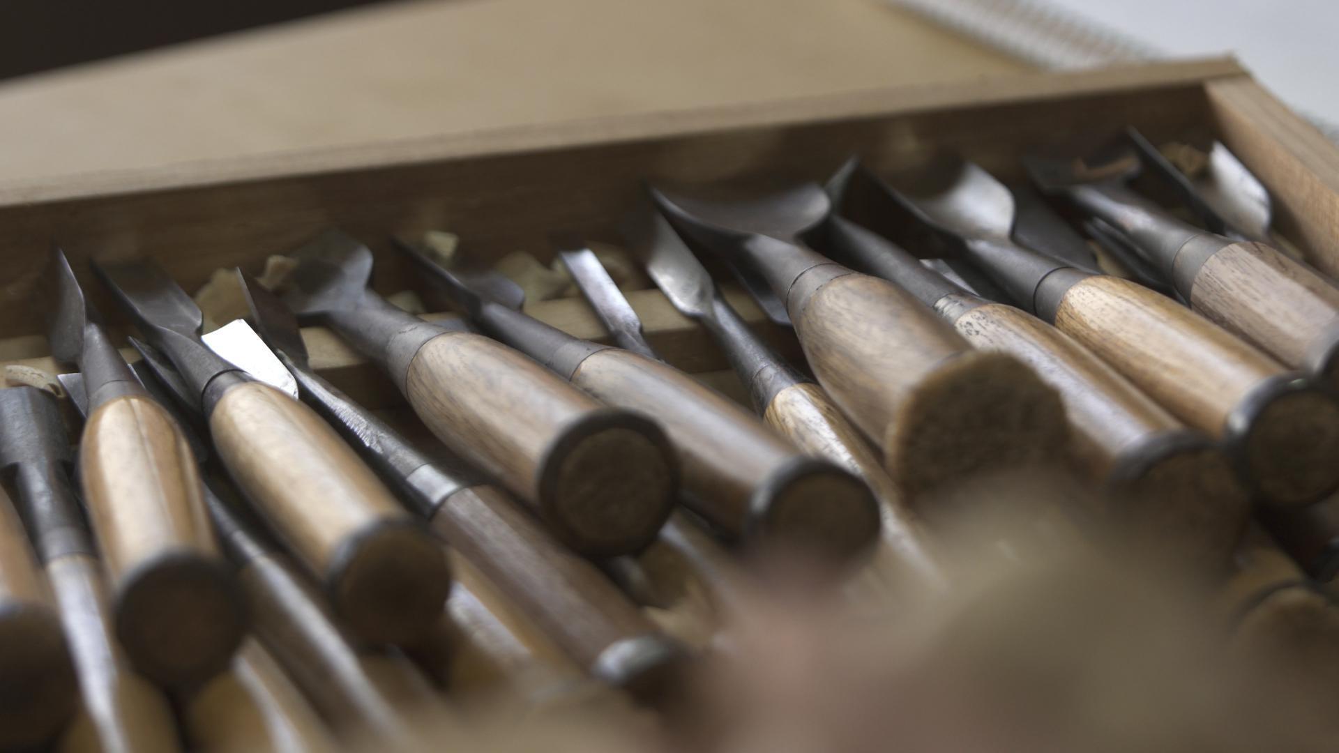 輪島塗は分業で漆器を作っています。木地師、塗師の丹精込めた仕事の後、鑿で削って加飾していきます。