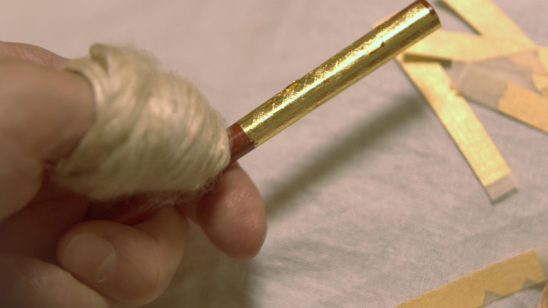 鍋に溶かした櫨蝋を手ですくい、塗り重ねて太さを出していきます。