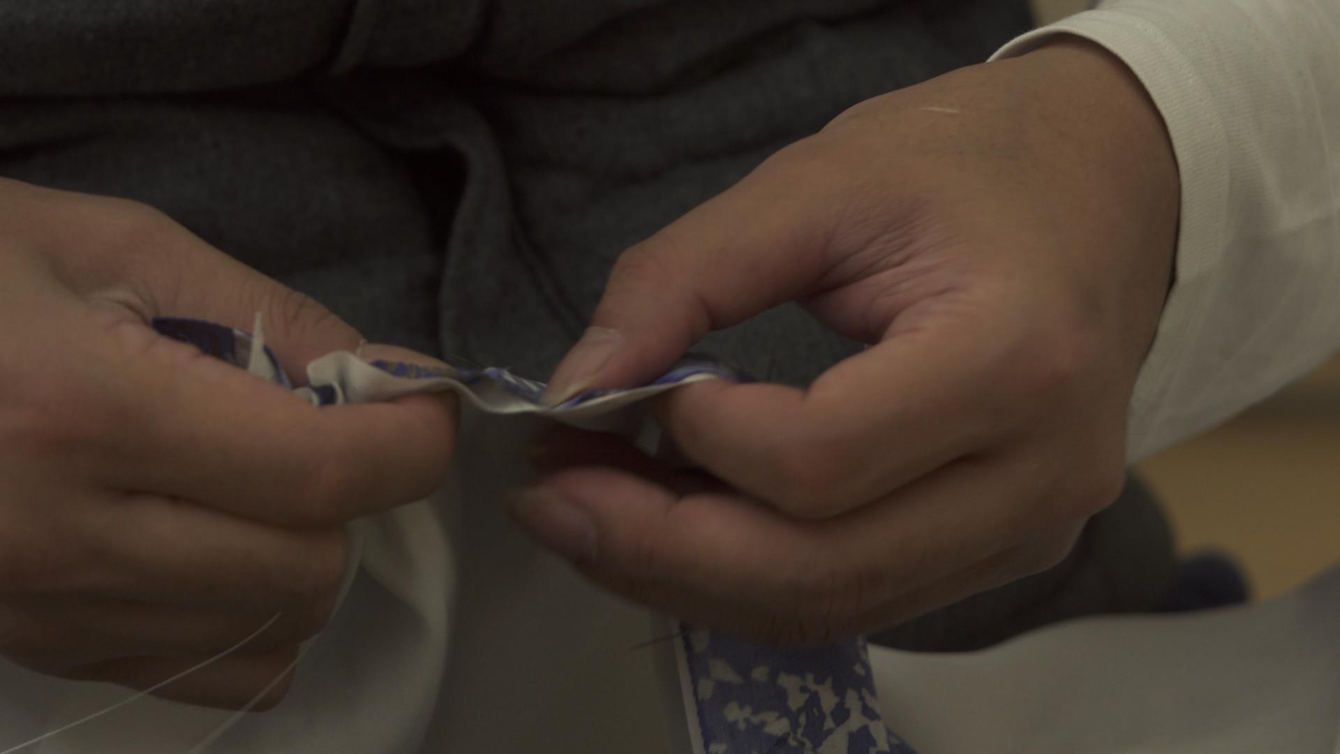使う道具も、針一本と絹糸だけ。使いにくくなった針はマチ針に。