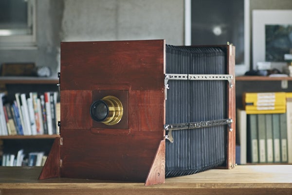 みなさん、ご支援本当にありがとうございます。 自分一人でやるしかないと思っていた作品が、みんなで作り上げる作品に昇華していくような感じがして、とても嬉しく思っています。 みなさんにもっとこの作品のことを知ってもらい、いろいろ共有していきたいので、ちょっとずつ機材紹介をします。 まずは自作の巨大カメラから。 正面から見るとトップ画像の様になってますが、カメラの後ろ側はこうなってます。磨りガラスのスクリーンになってて、ここにレンズを通ってきた光が像を作ります。 これは別のカメラですけど、こんな感じです。天地、左右が逆に写ります。(わかりづらいですかね。。。すみません。)ここで構図とか、フォーカスを合わせます。 そして、このスクリーンが取り外せる様になってて、、、外すとこう。 中は何にもありません。ただのがらんどう。現在の高性能カメラとは違い、機能は伸び縮みするくらいです。単純な機構なので、自作することが出来るんです。 それで、ここにホルダをセットするんですが、ホルダがこれ。 パカッ スーッ 引蓋がスライドする様になってます。ここに、薬品を塗布したガラスをセットします。 そして、これをカメラにピタっとはめて。 引蓋をスライドさせて外すと、レンズを通ってきた光が、感光面に焼きつくようになってます。 ちなみに全部をたたむとこうなります。 こんなにコンパクトに、、、とは言えないです。かなりデカイです。 という感じです。今回使用する巨大カメラでした。 自作するときに一番苦労したのは、蛇腹です。4〜5時間くらいひたすら写真の背景に使う大きな紙を折っていきました。蛇腹を折るだけでも難しいのに、それが大きくなるとこんなに大変だとは。。。それで、いざボディにくっつけようと思ったら、蛇腹が捻れてて上手くくっ付かない。それを治そうと思ったら破けちゃったりして。。。心の底から叫びました。 2回目でなんとか上手くいきましたが、これが破けたらもう本当に悲しい。いつか皮とかで、破れにくい蛇腹に作り変えたいです。でも、もう折りたくない。。。葛藤です。 ちなみにこのカメラで使うレンズはこれです。 詳しくはわかりませんが、Emile Buschというメーカーの古いレンズです。ebayで見つけて、はるばるフランスからやってきました。 このカメラで、職人たちの魂を撮ってきます。