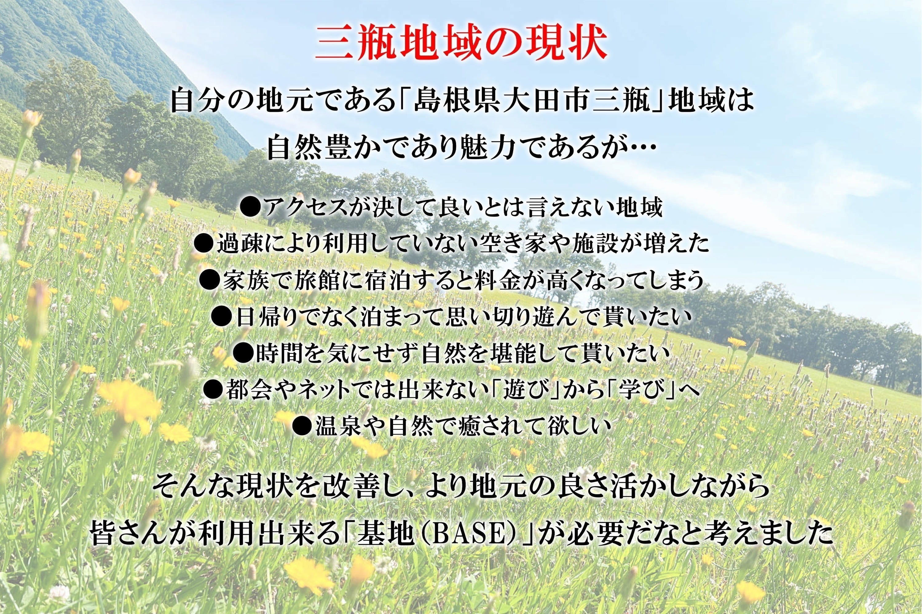 このたび、地元・島根県大田市三瓶町にある元宿泊施設を再生し、 インドアキャンプ型の宿泊基地「SANBE BASE」を作るため、改修費 300万円 を目標にクラウドファンディングに挑戦します。