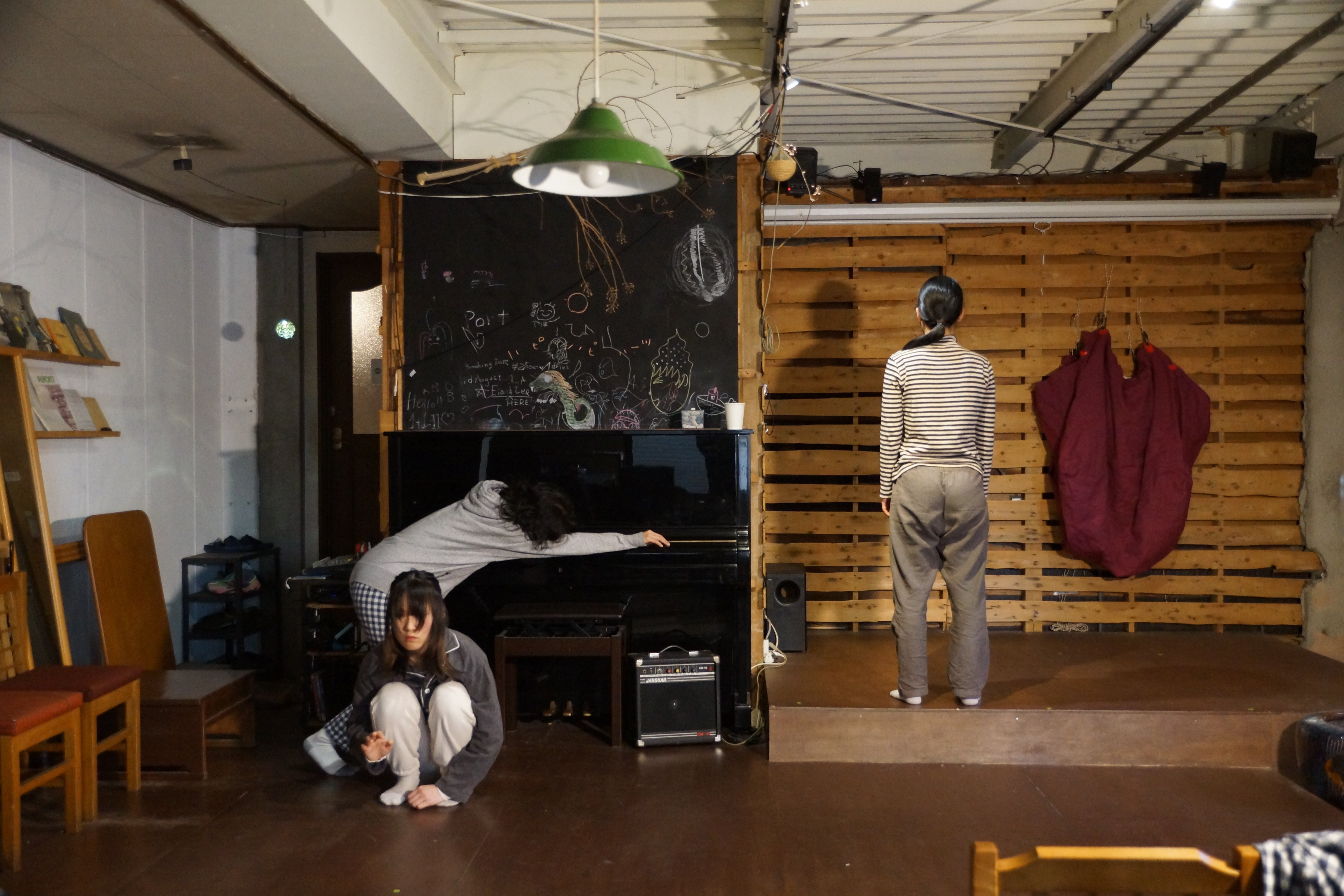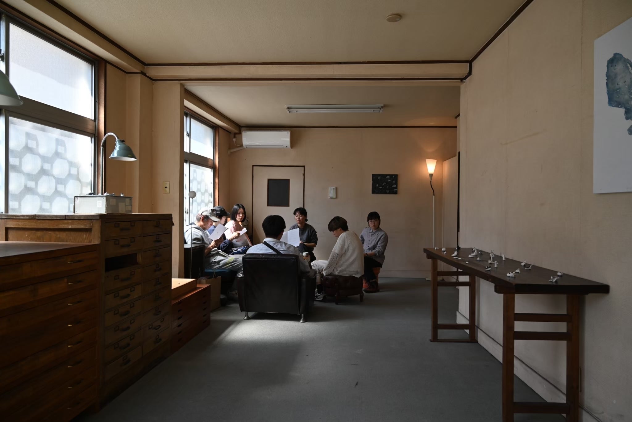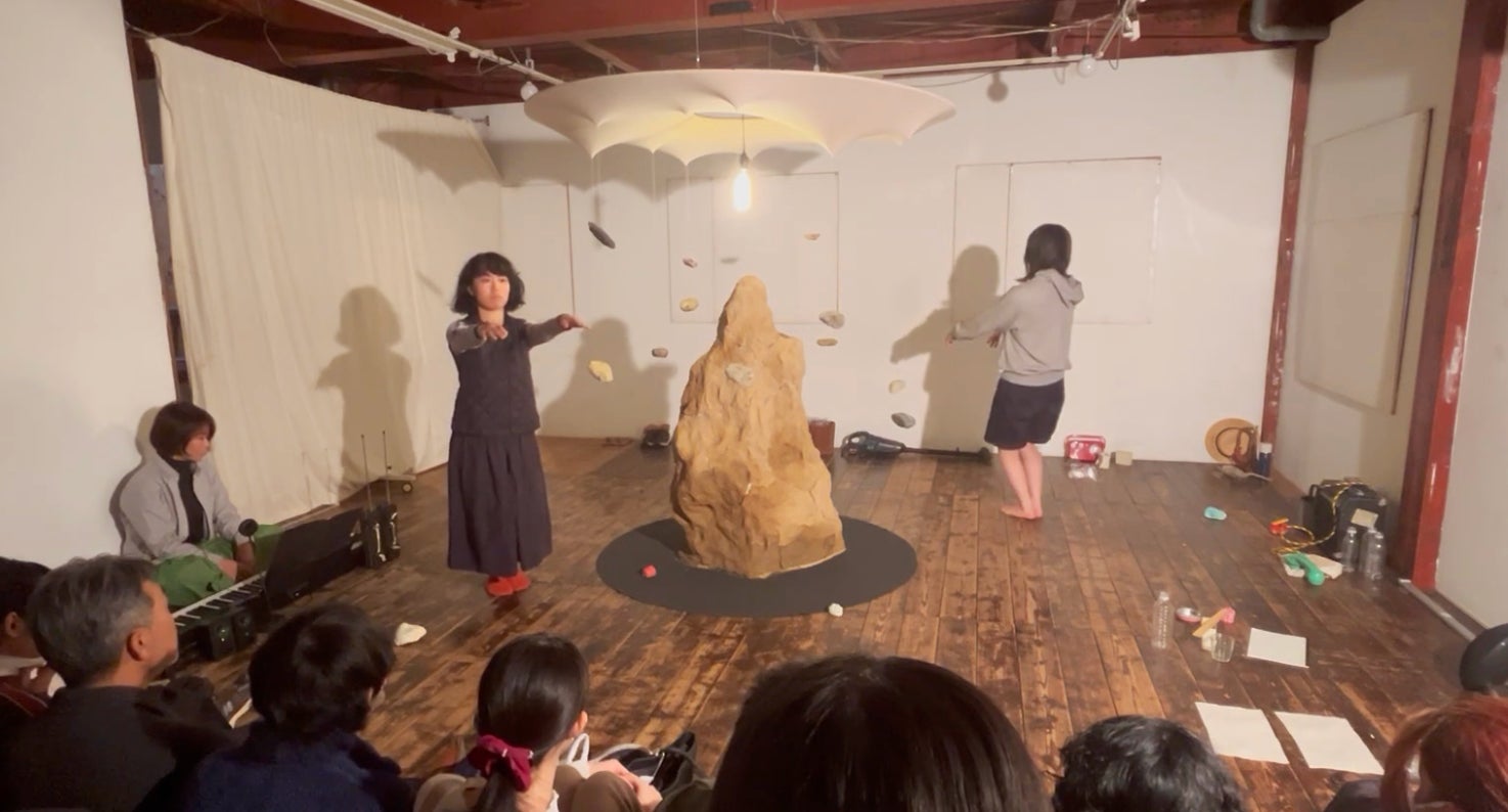 展⽰とパフォーマンスを切り分けず、4時間を⼀つの場として構成。作家と来場者が対等に関わり合い、多様な表現と応答が⽴ち上がる。作家11名参加、3⽇間で16名来場。