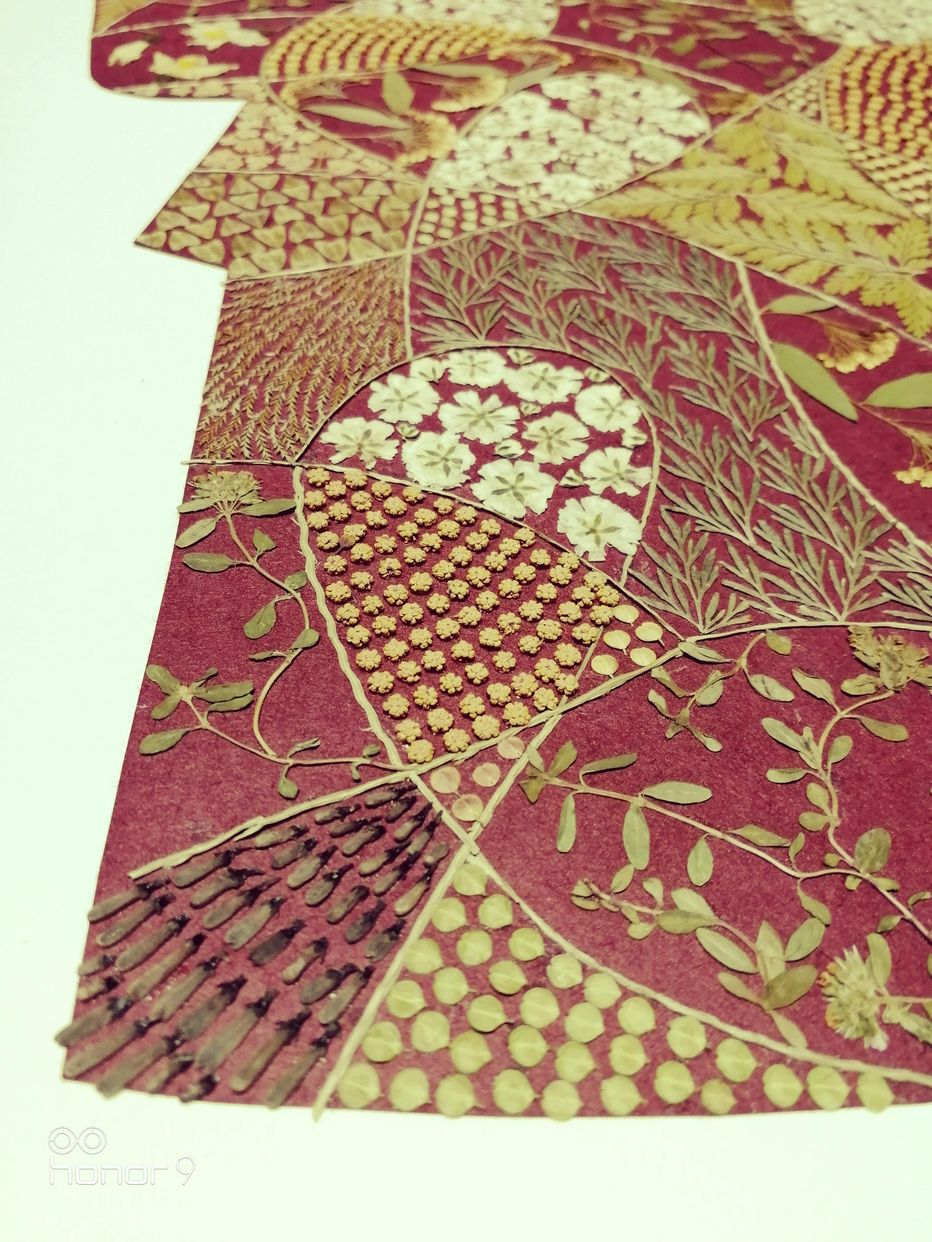 このアートは、鼻息で飛んでしまうほど…の繊細な工程。ここまで細かな押し花は珍しいようです。