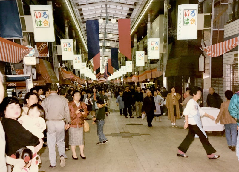 (平成元年頃のいろは商店街。自転車では通れないほどの賑わいだったという〈提供:いろは商店街・禁複製〉)