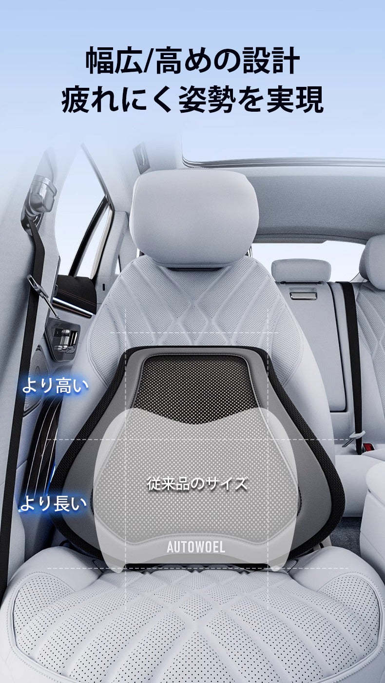 人間工学に基づく幅広・ハイバック設計が腰から背中までを包み込み体圧を分散し、長時間ドライブでも疲れにくい座り心地を実現します。
