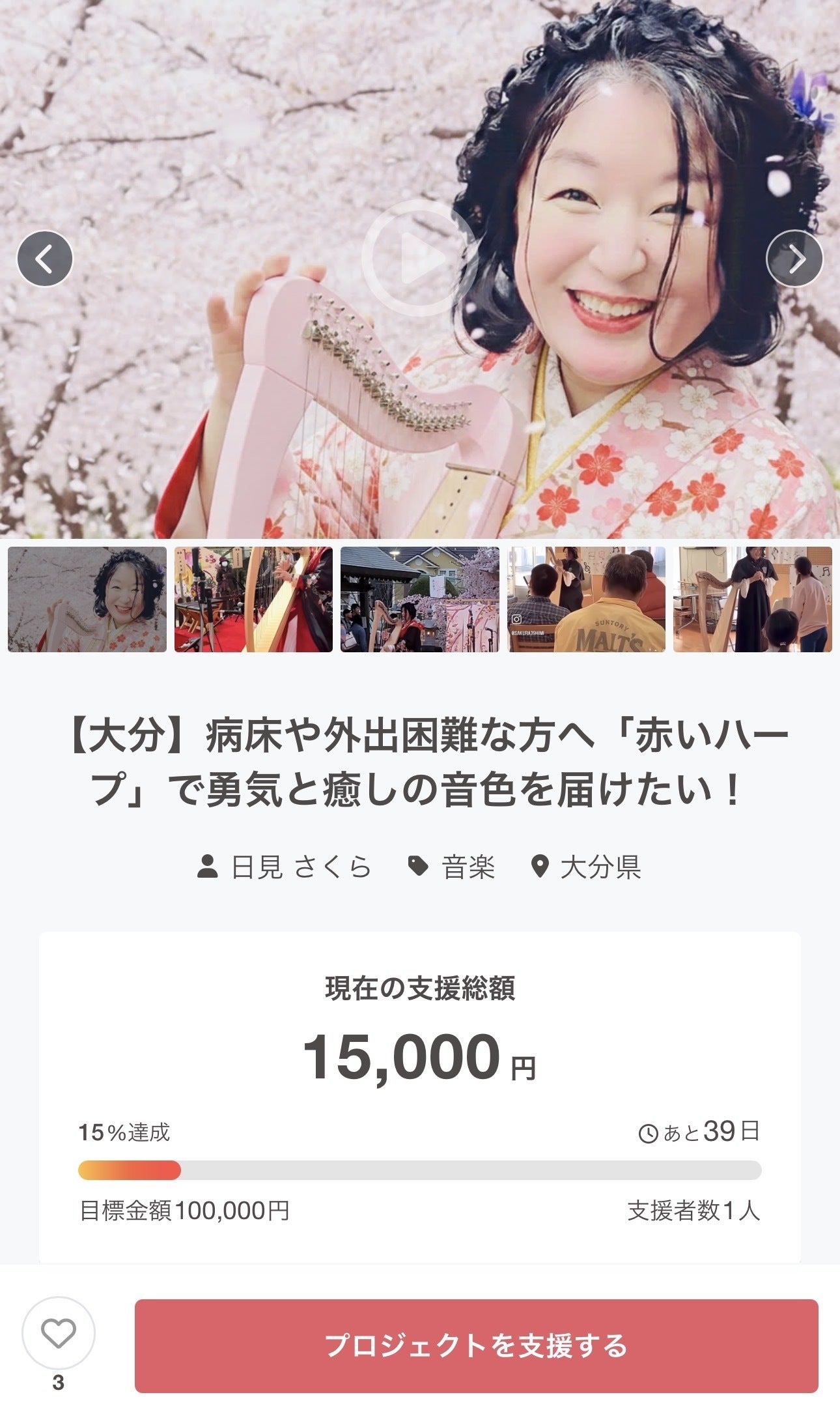 2026/04/22 23:30当プロジェクトをご覧いただきまして、本当にありがとうございます。日見さくらでございます。本日、スタートいたしました。なんと、「一人目の支援者さま」が誕生いたしました!画面越しにその数字を確認した瞬間、私の魂が震えるような、大きな勇気と感動をいただきました。最初の一歩を共に踏み出してくださったこと、心から感謝申し上げます。このプロジェクトは、病床にいる方や外出が困難な方、ご年配の方々など、音楽を必要としている方々へ…ハープの音色を通じて「勇気と癒やし」をお届けすることを目的としています。いただいたご支援は、皆さまの想いを乗せて、全国へ音色を届けるための大切な力に変えさせていただきます。残り39日。この勢いを大切に、さらに多くの方へこの願いが届くよう走り抜けます!引き続き、応援やシェアをいただけますと、大変心強いです。どうぞよろしくお願いいたします。日見さくら2026/04/22 もっと見る