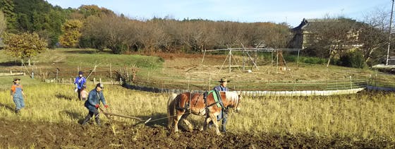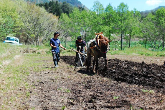 ガソリンを使ってトラクターを動かす代わりに、馬と田畑を耕す。