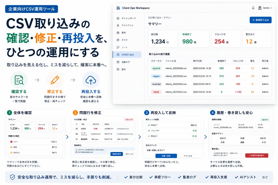 つまりこのプロジェクトは、CSVを便利に扱うためのツールではなく、企業の取り込み運用そのものを改善するための基盤づくりです。