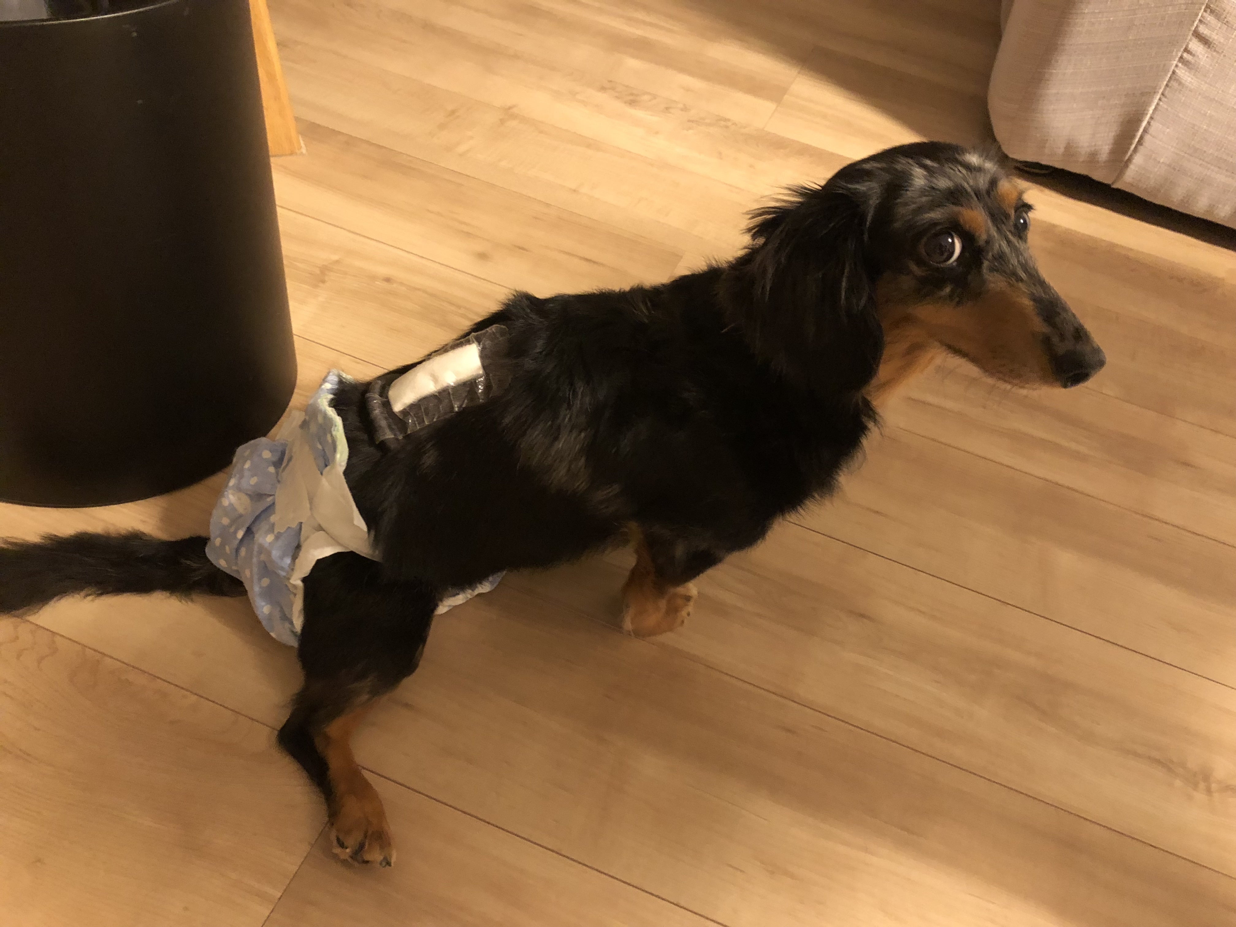 前足で動き回っておしっこだらけにするのでオシメしました。