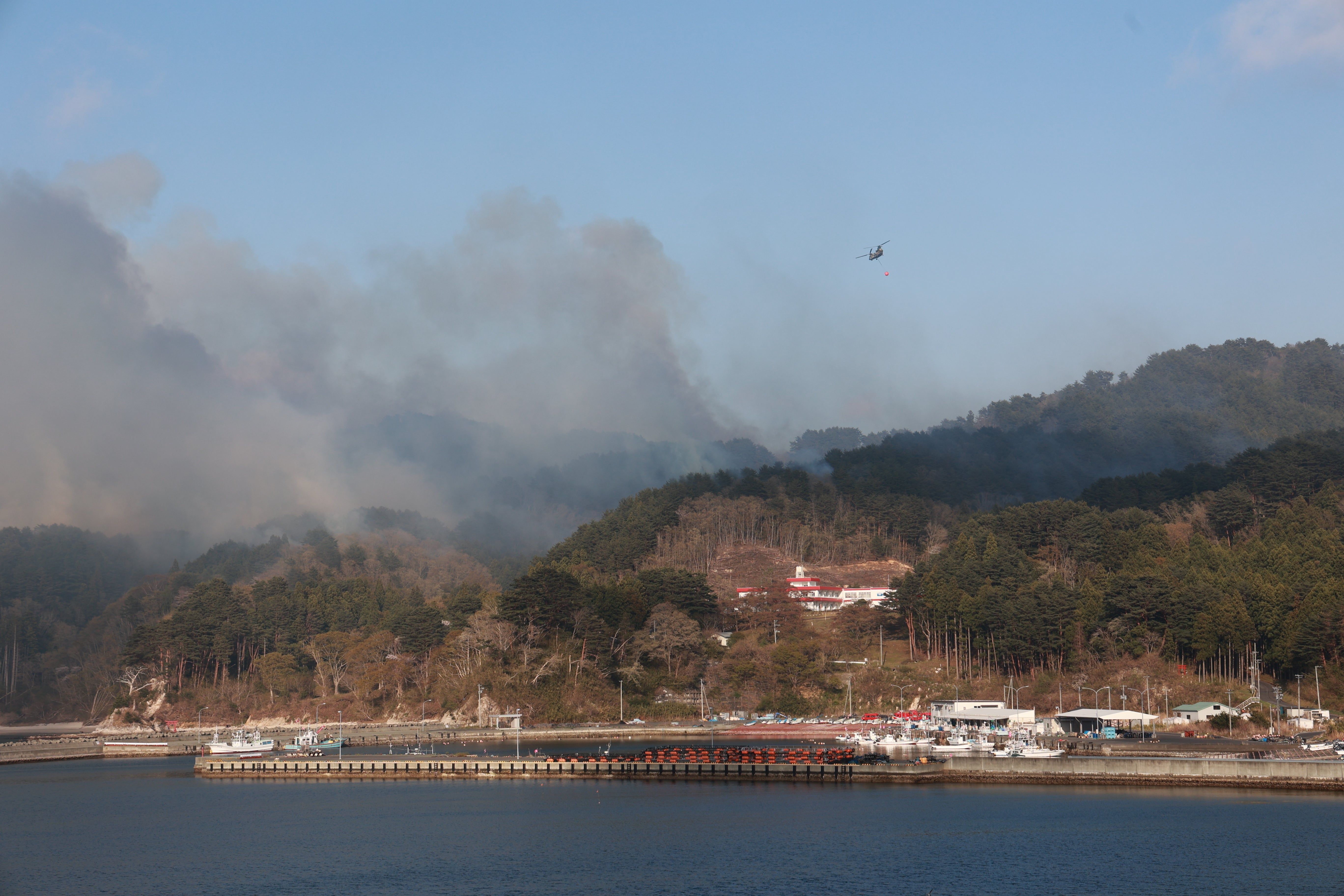 4月25日、山林火災発生から4日目。岩手県大槌町では、自衛隊や緊急援助隊、周辺地域から参集した消防隊による懸命な消火活動が続けられています。地上では総勢1,329名の消防員が消火にあたり、さらに自衛隊の大型ヘリコプター5機、中型ヘリコプター2機に加え、宮城県、秋田県、新潟県、栃木県、茨木県、横浜市の防災ヘリが空中から連続的に散水。大槌町一帯では、早朝から夕方までヘリコプターの音が途絶えることはなく、延焼が広がる不安の一方で、消防隊による懸命な活動が住民の希望と心の支えにもなっています。