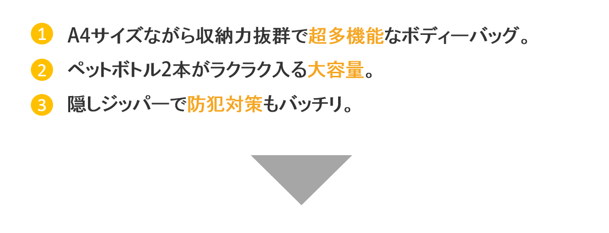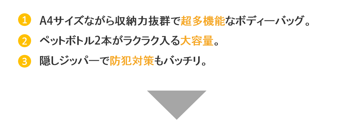 毎朝の通勤から近所のお出かけまで、どんな場面でも使えるオールラウンダーなボディーバッグを開発しました。コンパクトなA4サイズながら、ミニマムアイテムが収納できて超多機能。そしてお洒落なところがお薦めのポイントです。