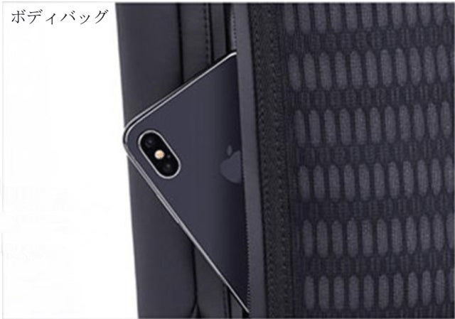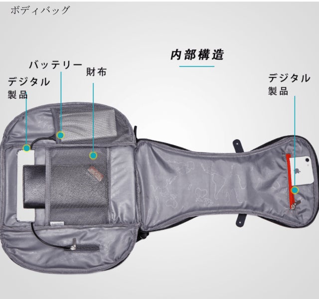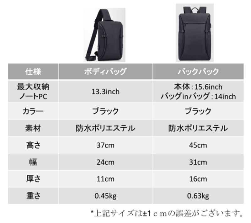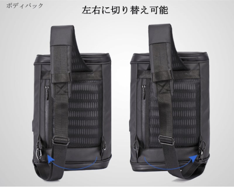 - ①2ジッパー180°全開MacBook Airがピッタリ入るボディバッグと超多機能バックパック
