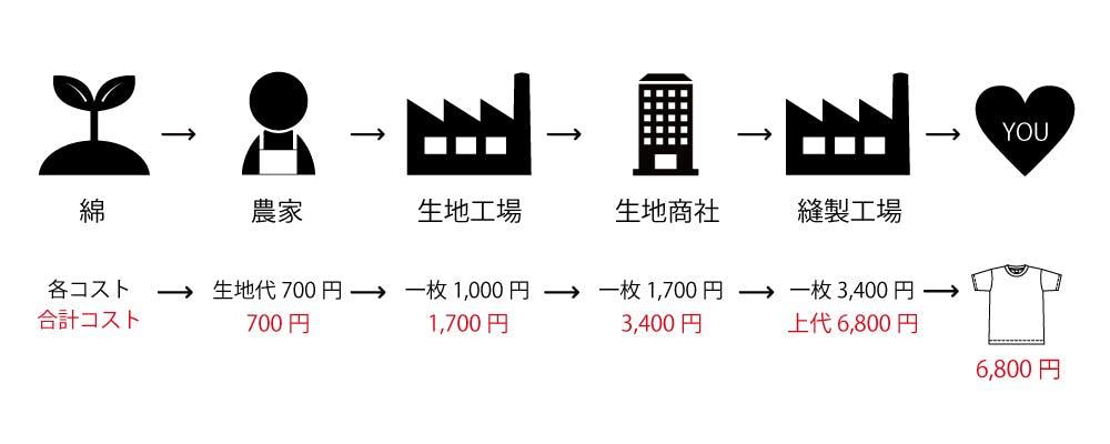 原価が7,800円だと、上の方で説明した既存のアパレルシステムに合わせると、みなさんにお渡し出来る価格は、28,000円ほどになってしまいます。