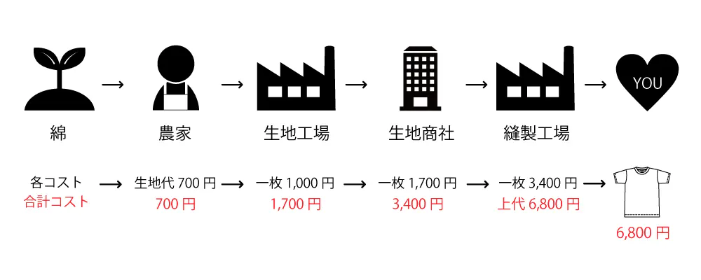 原価が7,800円だと、上の方で説明した既存のアパレルシステムに合わせると、みなさんにお渡し出来る価格は、28,000円ほどになってしまいます。