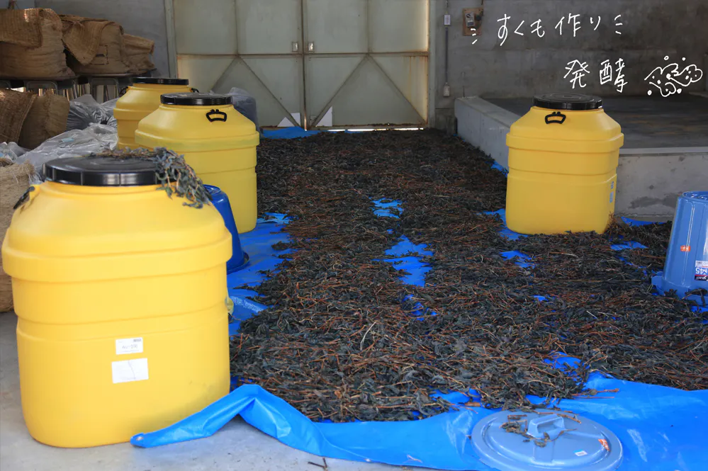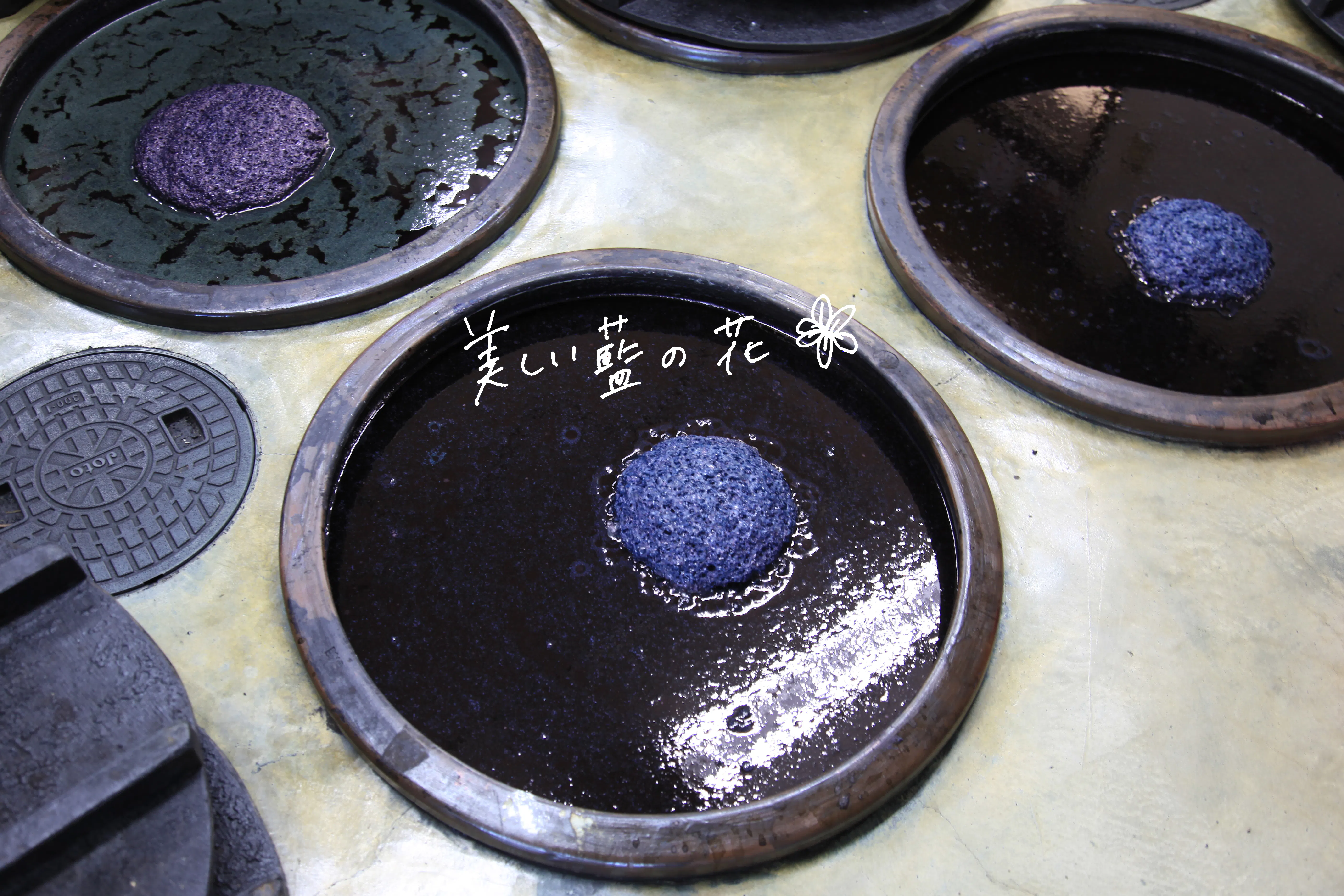 本藍は、蓼藍(タデアイ)を収穫し(3〜9月)、藍を発酵させた染料「すくも」を作り(9月〜12月)、藍建て(樫の木などの灰や日本酒などを入れて混ぜ、微生物の働きを活性化させ、ふすまや小麦の皮で糖分を加える)をすることで完成します。