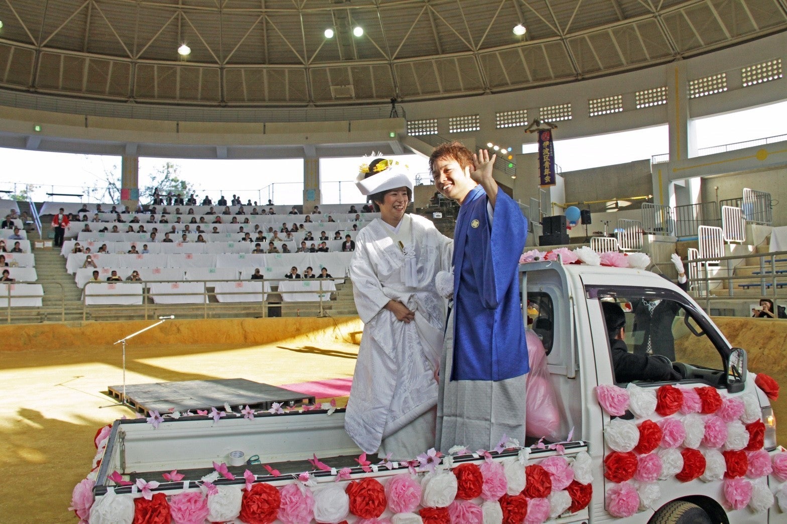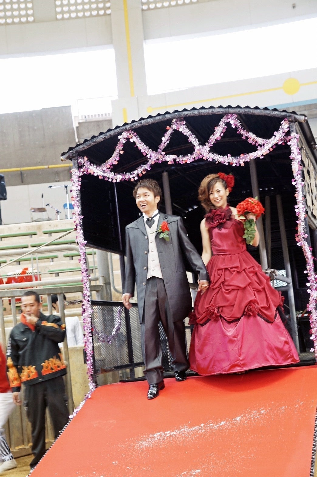 ②【沖縄県で初となる闘牛場披露宴を行う】会場には700人が列席し大盛り上がりをみせた。牛の前で愛を誓う牛前式、新郎新婦は闘牛を載せるトラックで入場、余興で闘牛を2試合行い、沖縄県内のマスコミは勿論、Yahoo!ニュースでも紹介された。(奥さんは剣道4段の実力者だ)