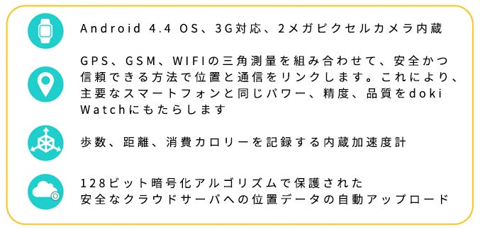 dokiWatchは、家族とのつながりに必要な機能があります。dokiWatchには、GPSトラッキングなどの重要な安全機能を搭載。これにより保護者は、スマートフォンで子供の所在地を知ることができます。電子ペット(dokiPet)は、フィットネスバッジなどの楽しいコンテンツによって、子供たちが健康で楽しく過ごせる時間をサポートします。