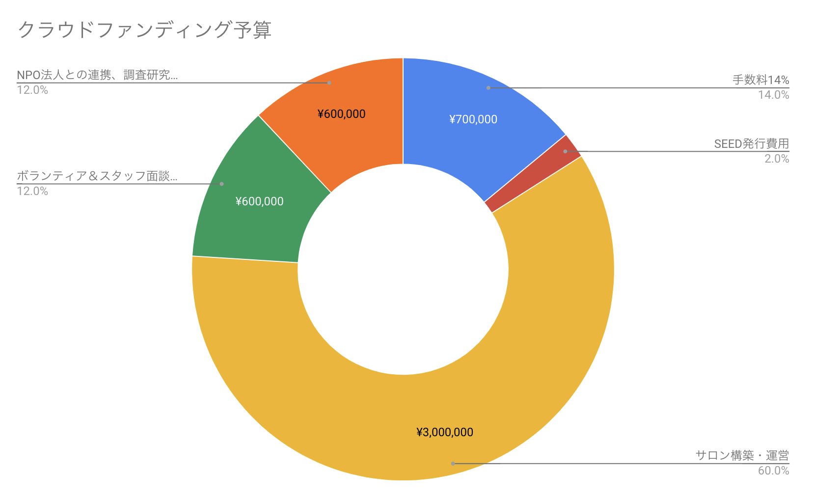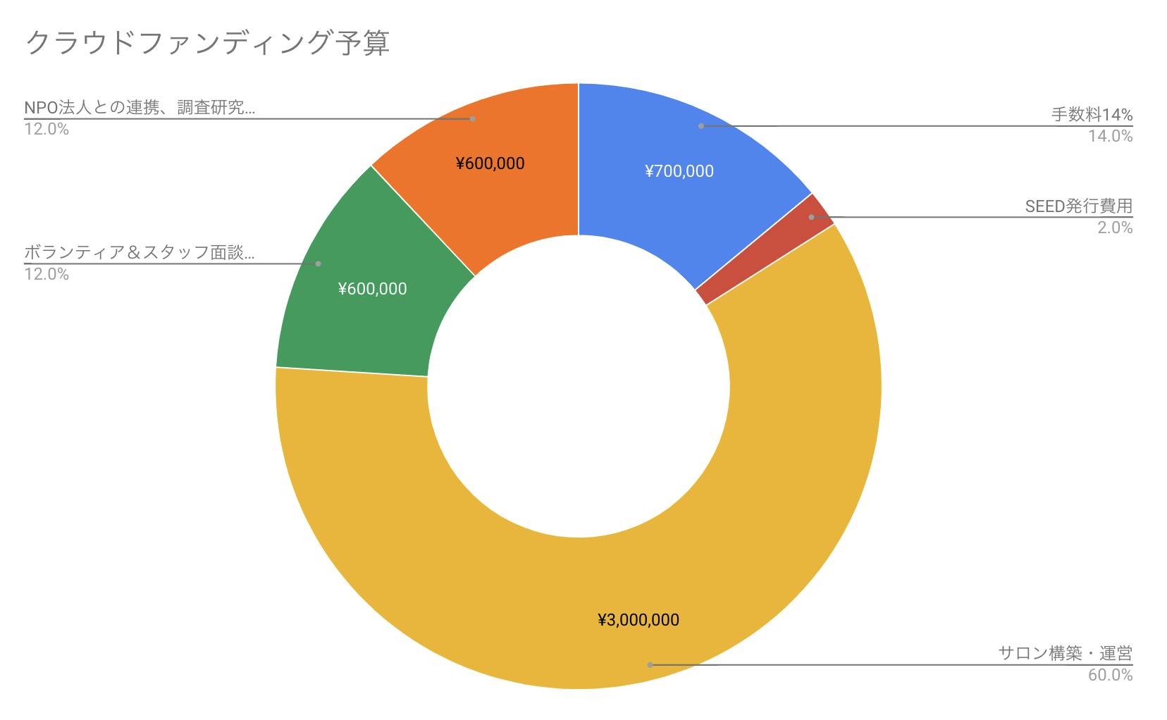 主な予算:SEED発行費用、サロン構築・運営、ボランティア&スタッフ面談・研修、NPO法人との連携、調査研究費など