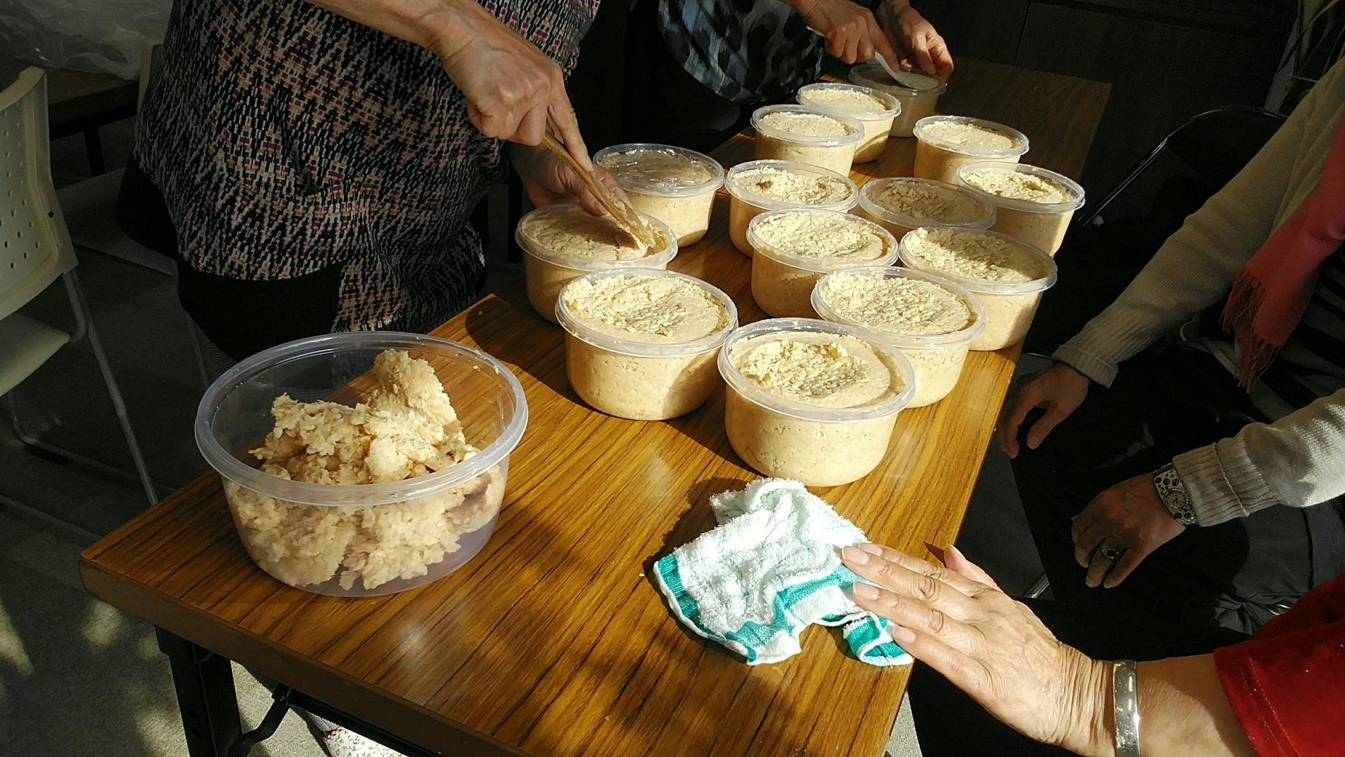 炊いた大豆を潰し、塩と混ぜた米麹と混ぜ合わせます。