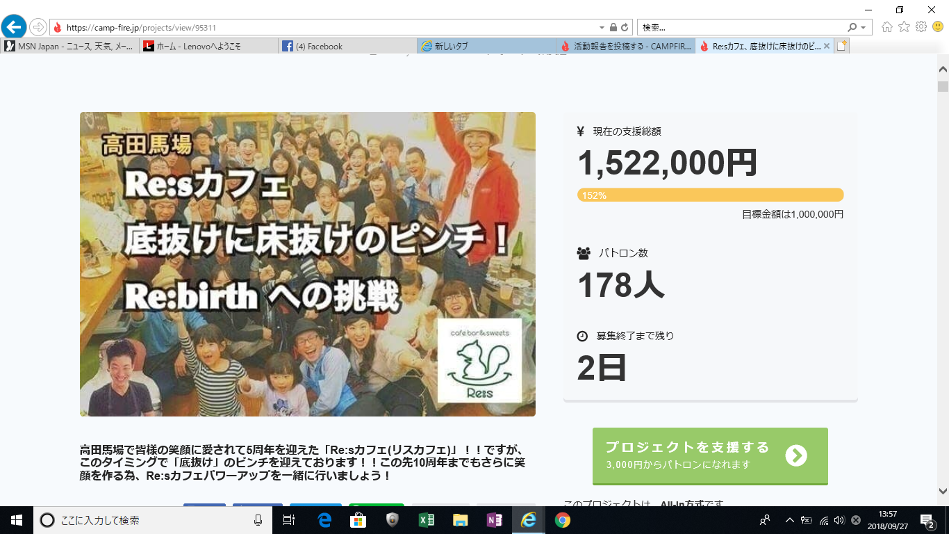 2018/09/29 18:07【1866000円を支援いただきました】 目標を大きく上回り達成!!! 皆様この度はご支援、ご協力いただきましてありがとうございました。 おかげさまで第一目標は10日あまりで達成し、第2の目標も、第3も達成することができました。 ありがとうございます。 ここから皆さんに支援していただいたお金とお気持ちをたくさんに受け取りリニューアルに向けて調整していかせていただきます。 また都度進捗を上げさせていきますのお楽しみにしていてください。 支援していただいたリターンに関しても都度送らせていただきます。お楽しみに。 一ヶ月お付き合いいただきありがとうございました!!! 株式会社 BIRTH OF SMILE Re:s cafebar&sweets 前田峻行 もっと見る