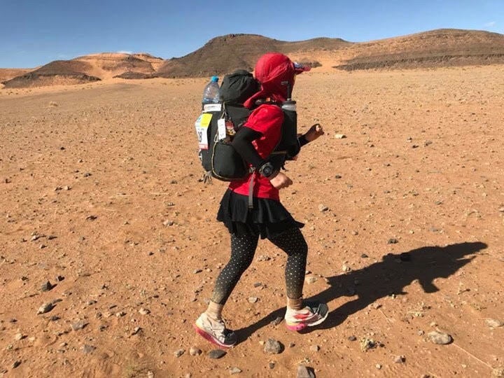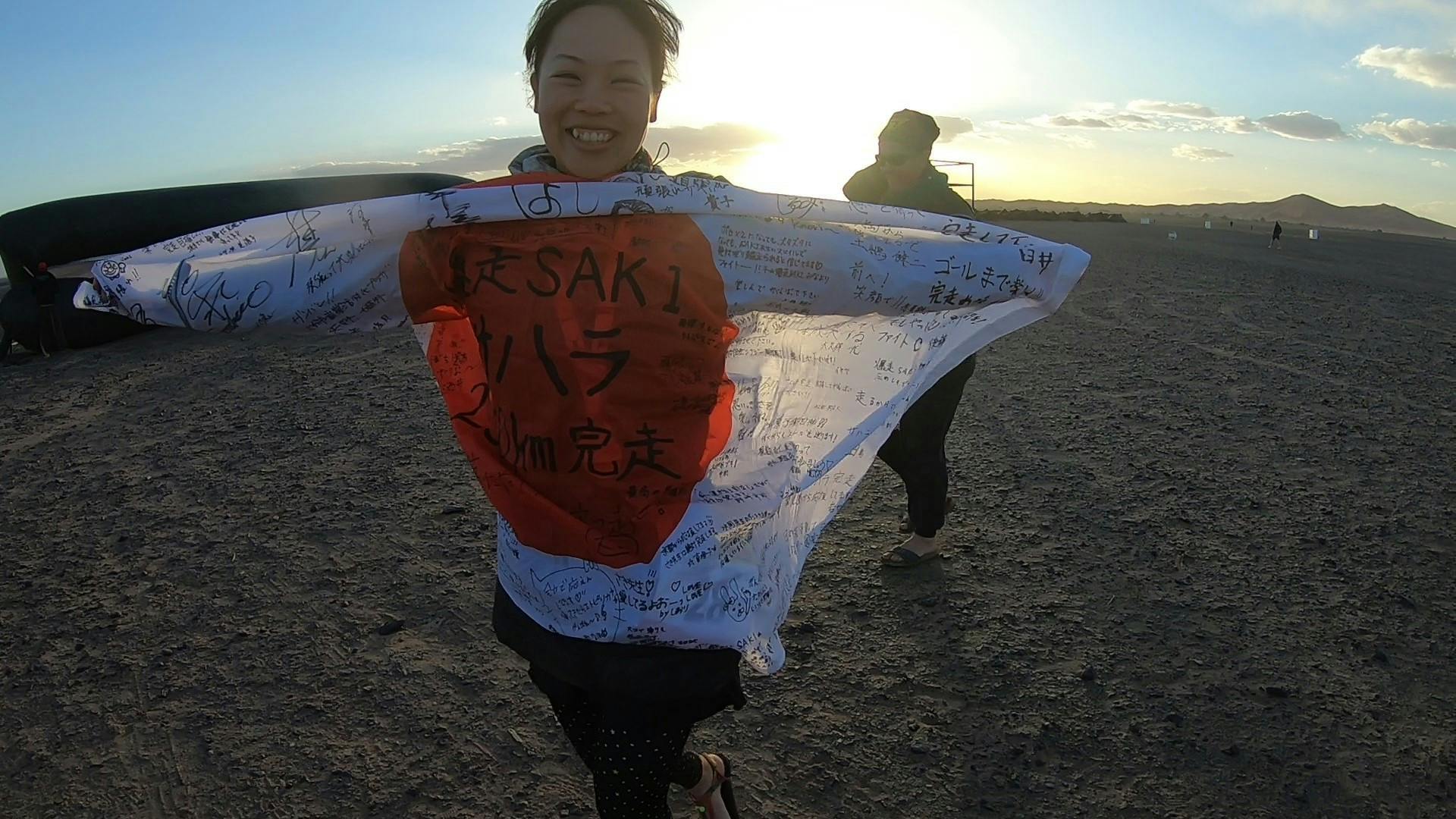 さらに自分に挑戦したくなり、世界で最も過酷なマラソンと言われる「サハラ砂漠マラソン2018」にエントリー。7日間分の食料・寝袋等(初日14㎏)を背負い、砂漠でテント泊をしながら250kmの道のりを進むステージレース。ここまでくると、もう私一人の夢ではなくなりました。沢山の方の応援を日の丸(国旗)に込めて、出発。