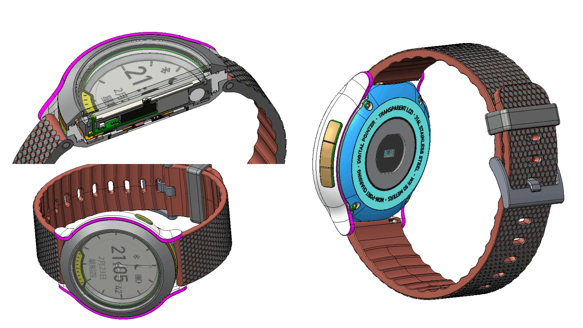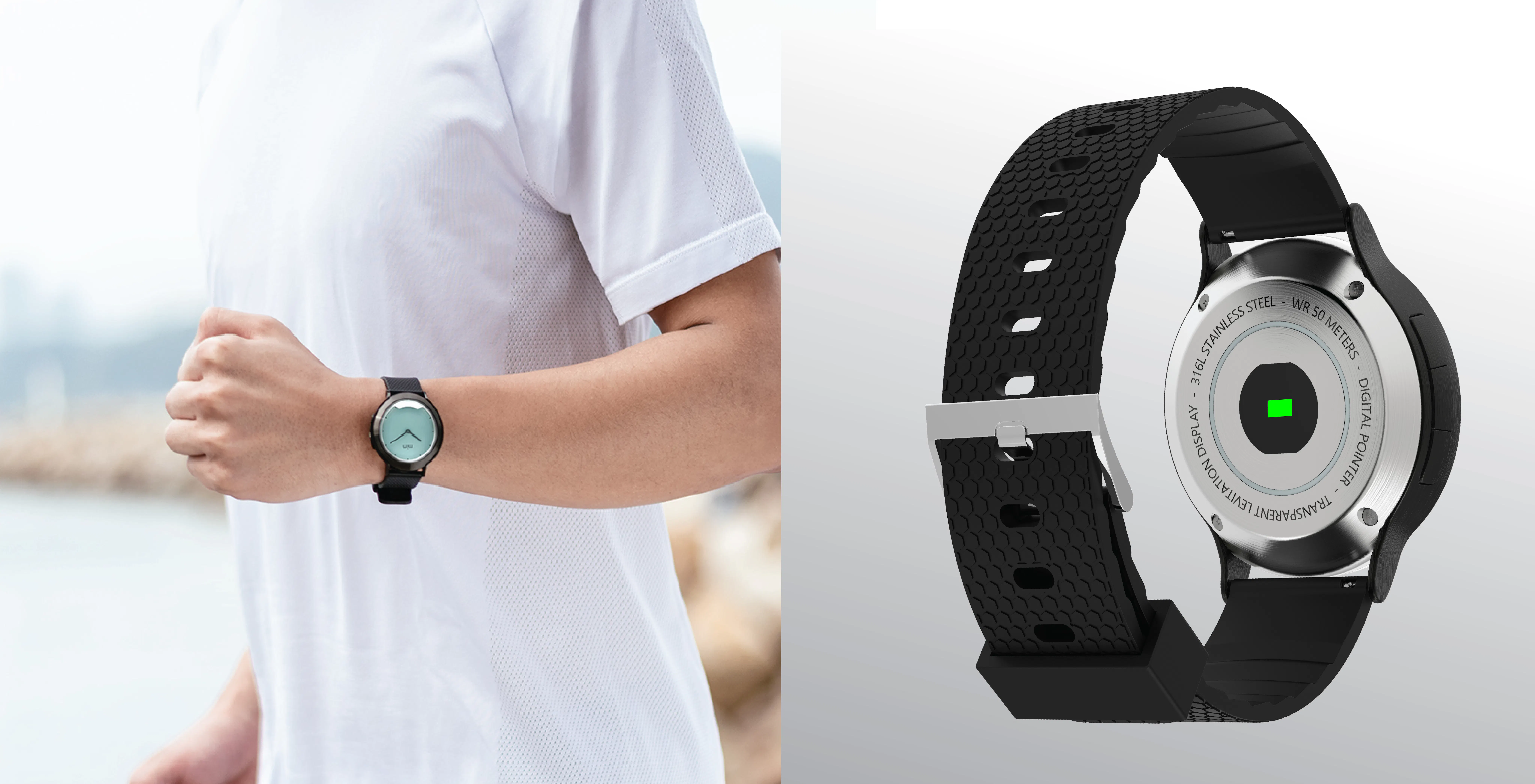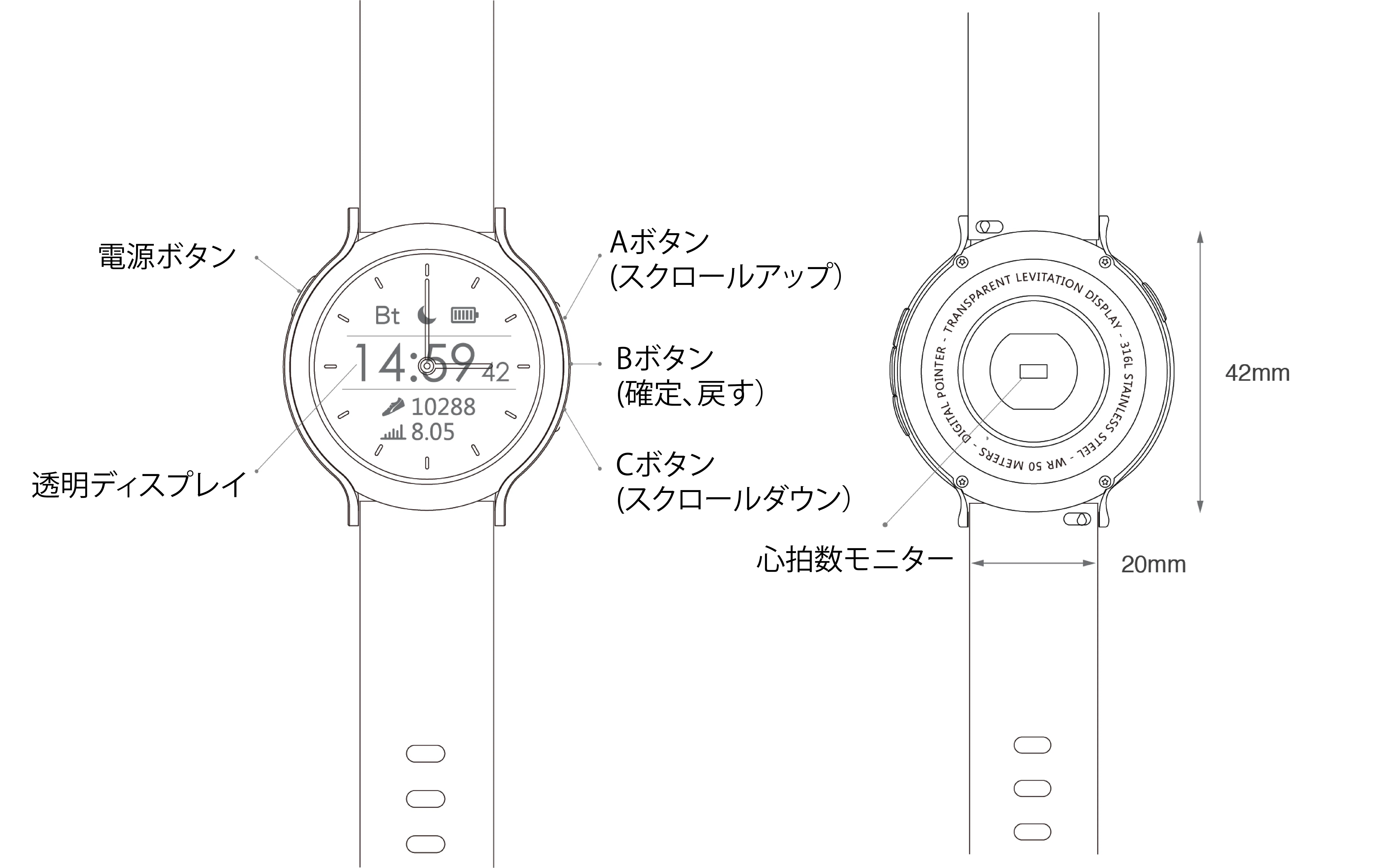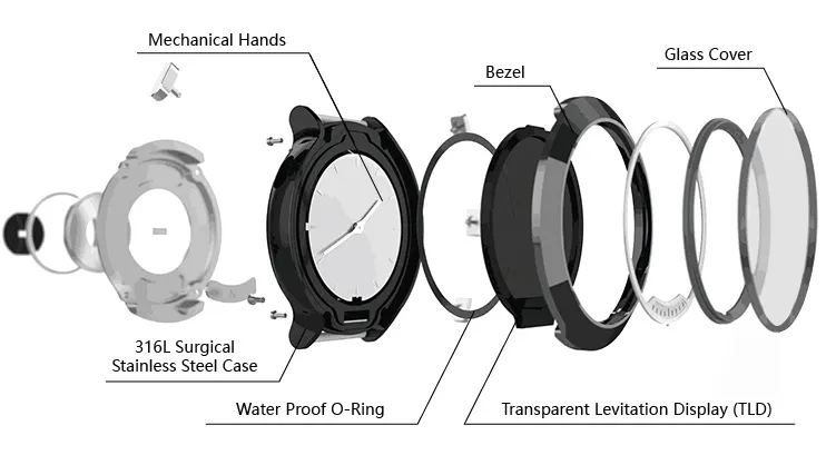 デザインと機能面の妥協で課題を解決しようとする他社の試みと差別化し、私たちは文字盤を覆う面を実際に透明な表示面として設計しました。全情報は文字盤を覆う面に表示され、使用しない時は表示が完全に不可視となります。