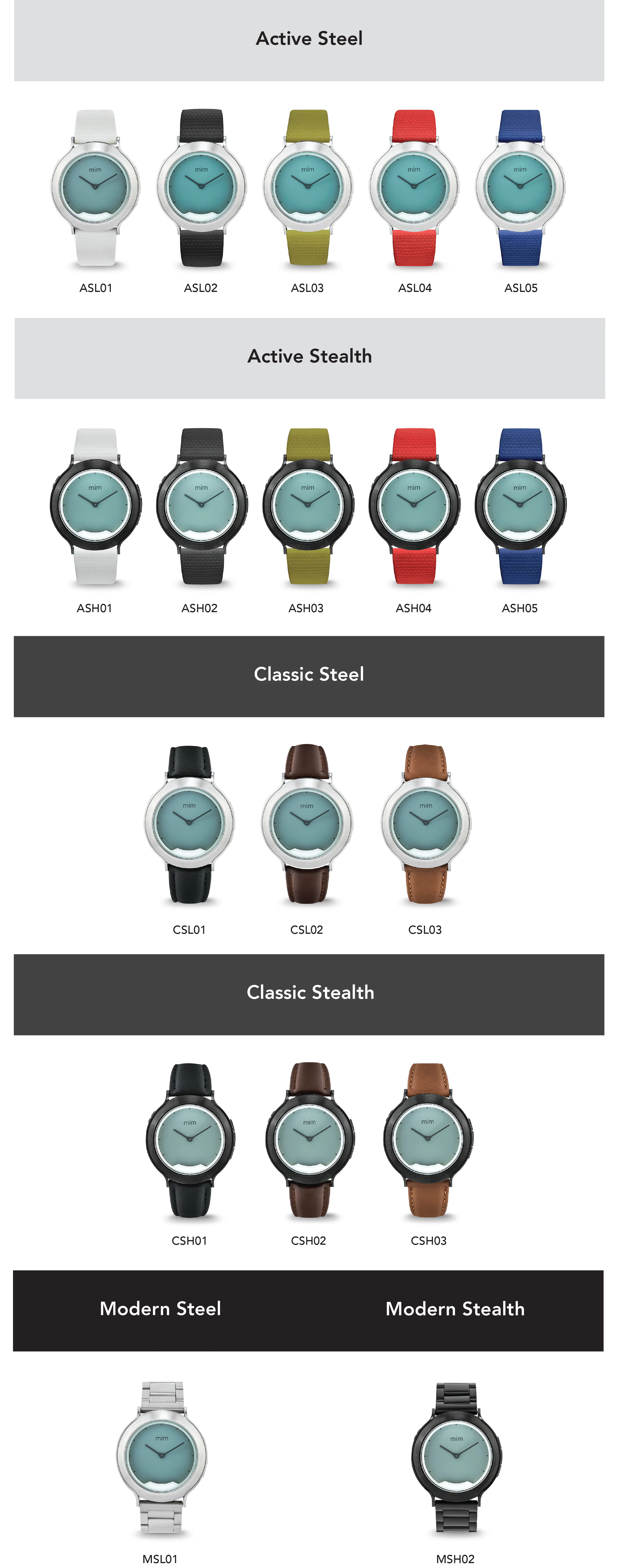 mim Xの仕上げは、スチールとステルスの2種類です。ともにサージカルグレードのステンレス鋼で仕上げられ、日常使用での防汚性と耐擦傷性に優れています。また気分に合わせて選べる、様々なバンドコレクションも提供しています。