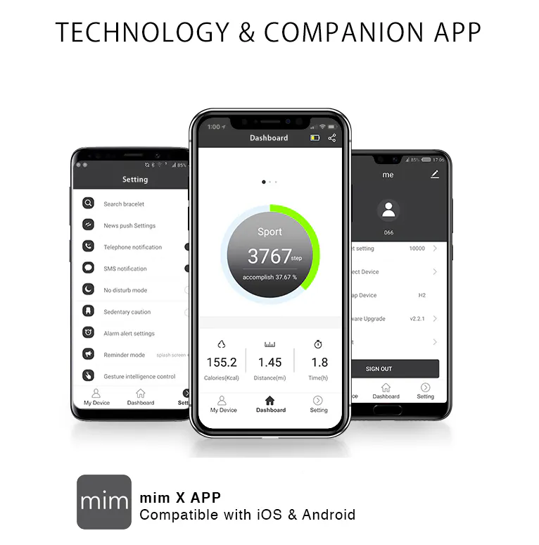 mim X アプリは、最適なスマートウォッチ機能のために特別設計されています。またiOSとAndroidデバイスの両方に互換性があるアプリで、どんなスマホでも対応します。以下は機能の数例です:心拍数モニター、歩数モニター、睡眠モニター、座席通知、セデンタリリマインダー、find my device(デバイスを探す)。