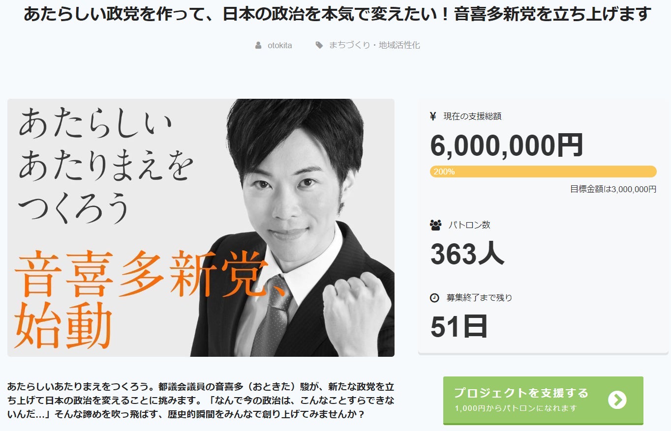 こんばんは、おときた駿後援会スタッフです。 みなさまよりご支援いただき、音喜多新党「あたらしい党」は本日結党いたしました。先ほどの記者会見でも発表いたしましたが、新党名は「あたらしい党」。 このペンギンさん…めちゃくちゃ可愛くないですか!?この子をちりばめて、ステッカー・うちわ・Tシャツなどのデザインしていく予定です。 特にTシャツ…絶対可愛い…これを着て新党をぜひ応援してください〜!「このデザインならTシャツが欲しい」という方、ぜひ追加のご支援もご検討くださいませ!! 新党のHP、各SNSも本日オープン!フォローお願いいたします。 あたらしい党HPhttps://newparty.jp/ あたらしい党 公式Facebookページhttps://m.facebook.com/newparty.jp/ あたらしい党 公式Twitterアカウントhttps://twitter.com/newparty_jpあたらしい党 公式Instagramhttps://instagram.com/newparty.jp パトロン1000人まであと約200人。ペンギンさんとともにすべての目標達成を目指します!!引き続きよろしくお願いいたします。 おときた駿後援会スタッフ === ■すでにご支援いただいた方へ 本当にありがとうございました! 引き続きお知り合いへのお声がけや、 情報拡散に協力していただければ幸いです。 こちらからも折に触れて活動報告を配信しますので、 そのタイミングで拡散していただけると嬉しいです!また追加のご支援も可能ですので、ご検討くださいませ。 ■まだご支援はしていない方 最小で3,000円、学生1,000円からご支援いただけます。 パトロン1,000人を必達したいので、 ぜひご検討いただけるようお願いいたします。 ■金銭的なご支援が難しい方 情報拡散も力になります!SNSで発信したり、 友人知人へこのクラウドファンディングの内容を伝えてください。