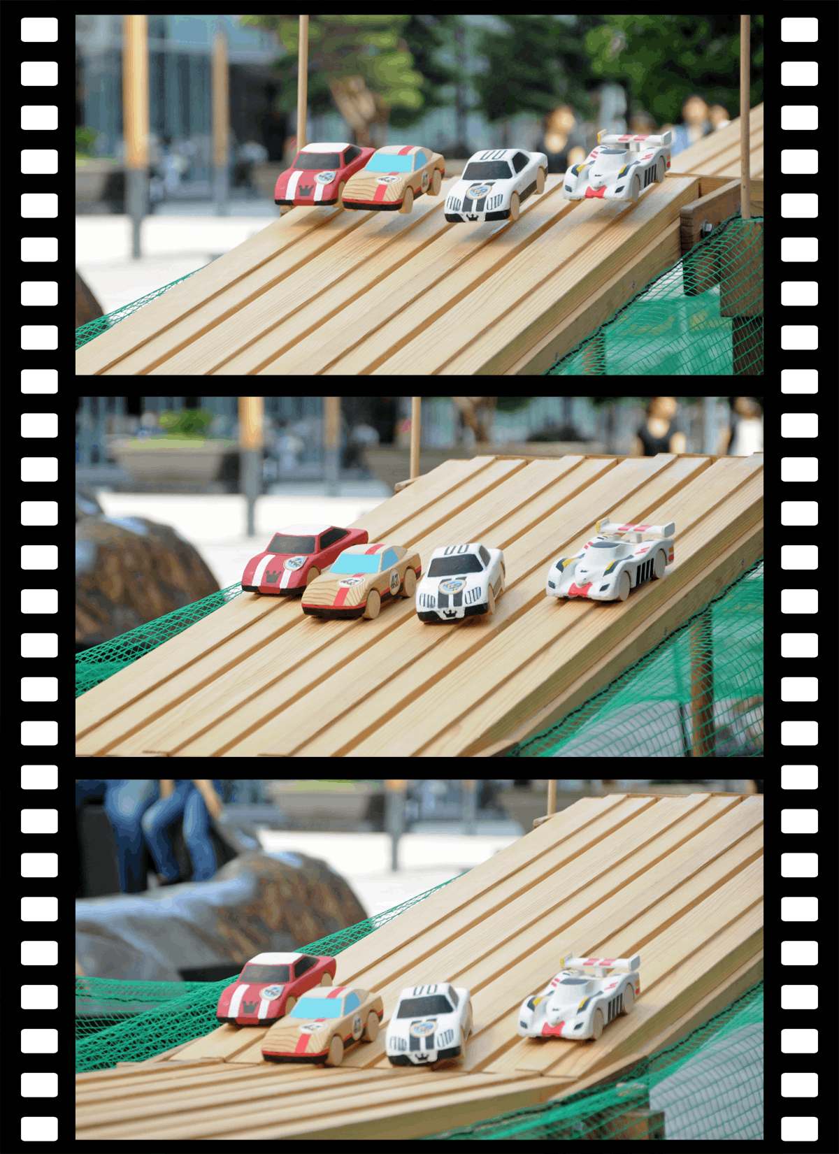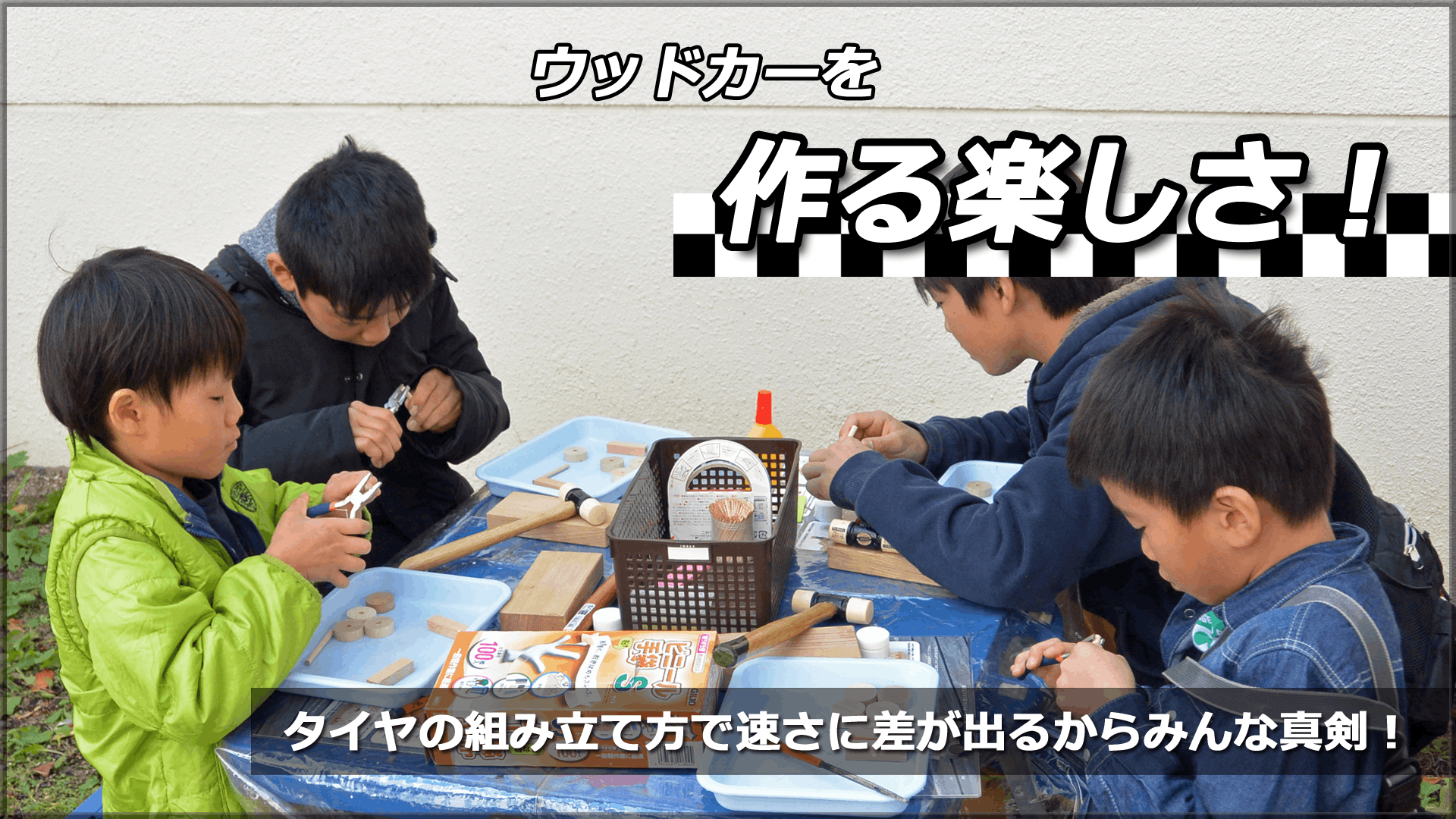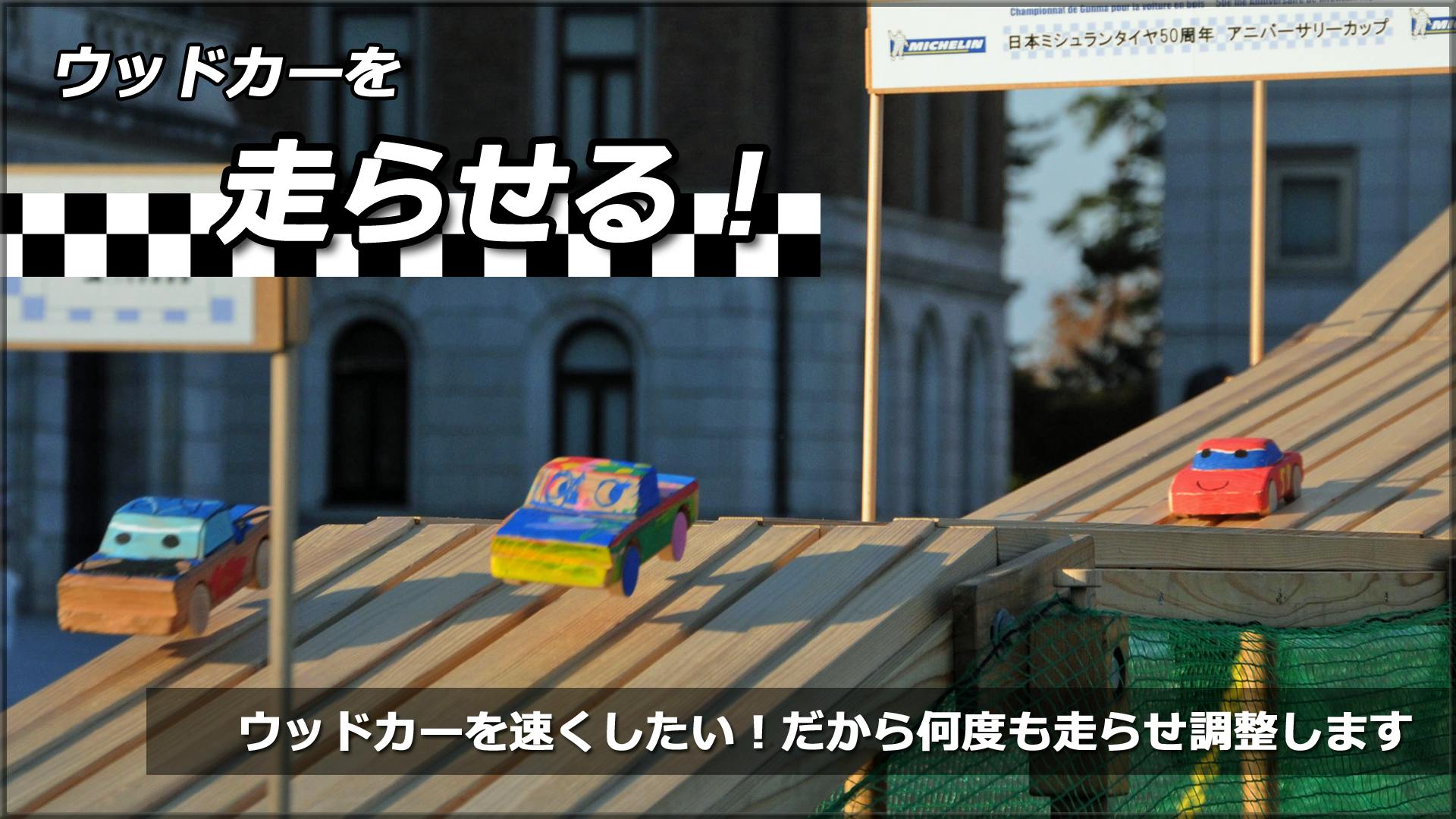一見、単純で運まかせに見えるウッドカーレースですが、技術や創意工夫でウッドカーを速く走らせることができます。