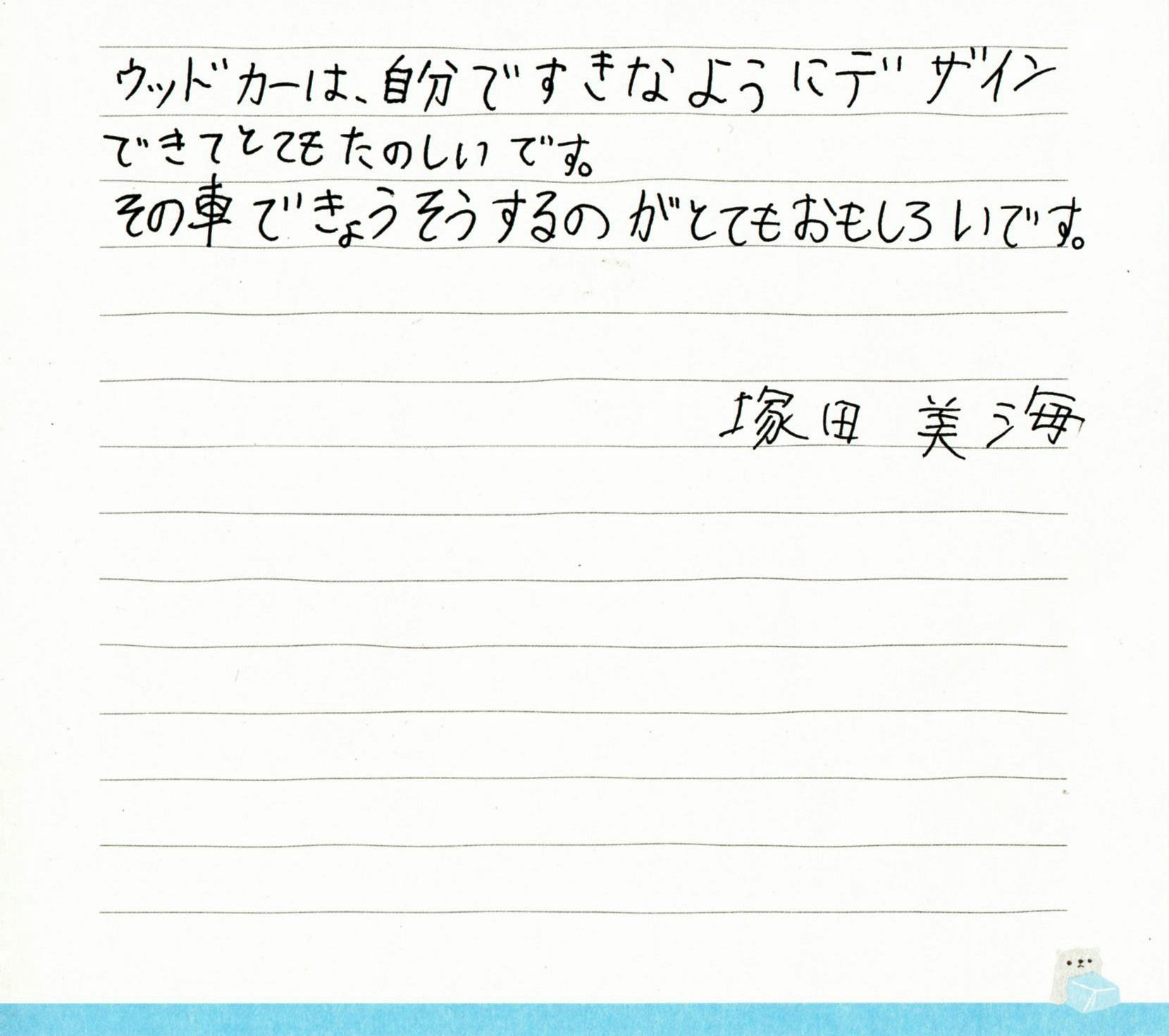 2018/11/20 19:12桐生花ぱんカップ2018で#1つかだ みう選手のウッドカー「花パンGO」は、練習走行開始当初3.90秒台のタイムを記録しましたが、若干安定感に欠け蛇行してタイムを落としているため、思い切ってタイヤ周りを新しく作り直しました。その結果、公式予選ではコースアウトなどが多くなりタイムも振るわず、予選16位という結果に終わりました。大会終了後のフリー走行で、つかだ みう選手とウッドカーのセッティングについて話しました。花パンGOはDレーンを走った時に左へ曲がる傾向があり、それがコースアウトの原因となっていました。なのでつかだ みう選手と相談してステアリングを右へ少し切り、軸受に紙やすりの切れ端を挟みました。その結果花パンGOはコースアウトせずにゴールまで走るようになりました。ウッドカーレースは結果が全てではありません。自分で考え決断し失敗してもそれを踏み台にして、次はどうすればよいかを考えてもらいたいと思っています。私はつかだ みう選手の、上位に入るためにリスクを恐れず、タイヤ周りを作り直すという挑戦を高く評価しています。 もっと見る