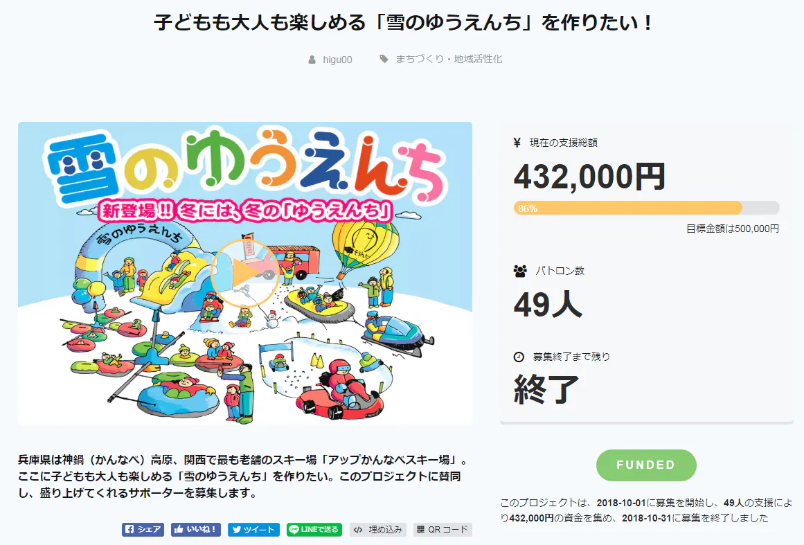 2018/11/08 14:08この度は、アップかんなべの「雪のゆうえんち」プロジェクトに ご支援やご関心をお寄せいただき、誠にありがとうございました。 一か月の期間で49名のパトロンの方々から432,000円の金額を ご支援いただくことができました。 直接にご支援いただいた方のみならず、このページを見てくださっているすべての方に、 まず、この場をお借りしてまずお礼申し上げます。 終わった後の率直な感想は、「大変だったけど、やって良かった」と思っています。 クラウドファンディング期間中は、「応援したいけど、 インターネットでの支援方法がわからないから」、と現金をくれて支援してくださった 地元の方々もいらっしゃいました。 また、普段スキー場で顔合わせる方から、「今年はこんなことやるんやね」と CAMPFIREを通して知っていただき、スキー場運営について意見をもらうこともできました。 またまた、スキー場の運営に関してこれまでのお客様からメッセージで様々な (そして、めっちゃおもしろい)ご提案をして下さる方もいらっしゃいました。 こういう一つ一つが今回の挑戦で生まれた出来事でした。 今後も「アップかんなべ」をもっと身近に感じていただき、 「なんとなく応援したい施設」、と思っていただけるように こういった機会をつくっていきたいと思います。 重ねまして、ありがとうございました!! これからも応援宜しくお願いします! アップかんなべ 樋口 P.S. 準備の状況をみなさまに共有します! こちらがフワフワ滑り台エリアに置く遊具たちです! オープンは12月下旬予定!乞うご期待~。 もっと見る