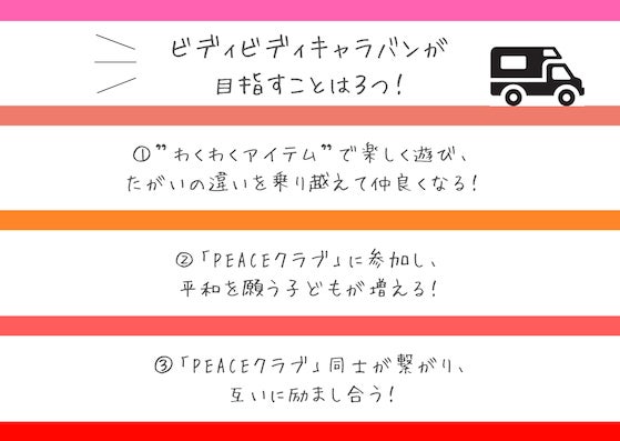 そこで、私たちはキャラバン(大型車)で遊びの道具を子どもたちに届け、【PEACEクラブ】と子どもが一緒に遊べる場を作ります!