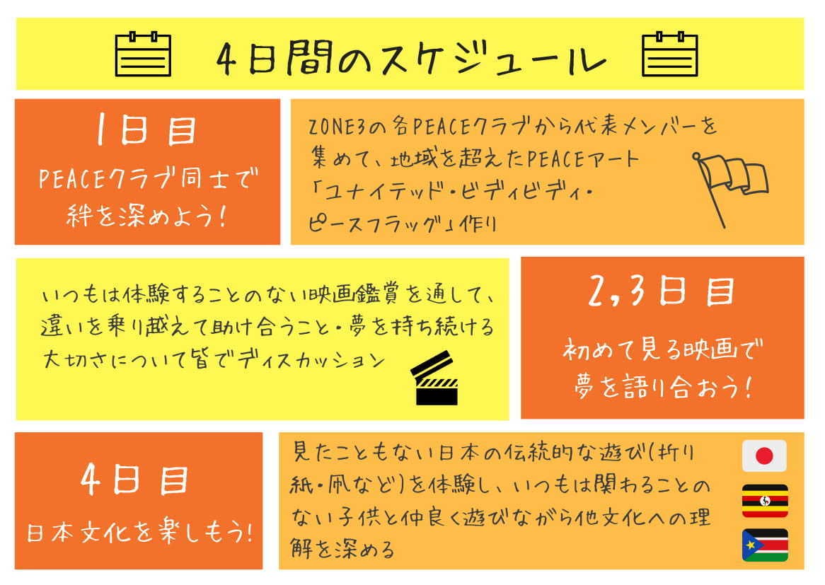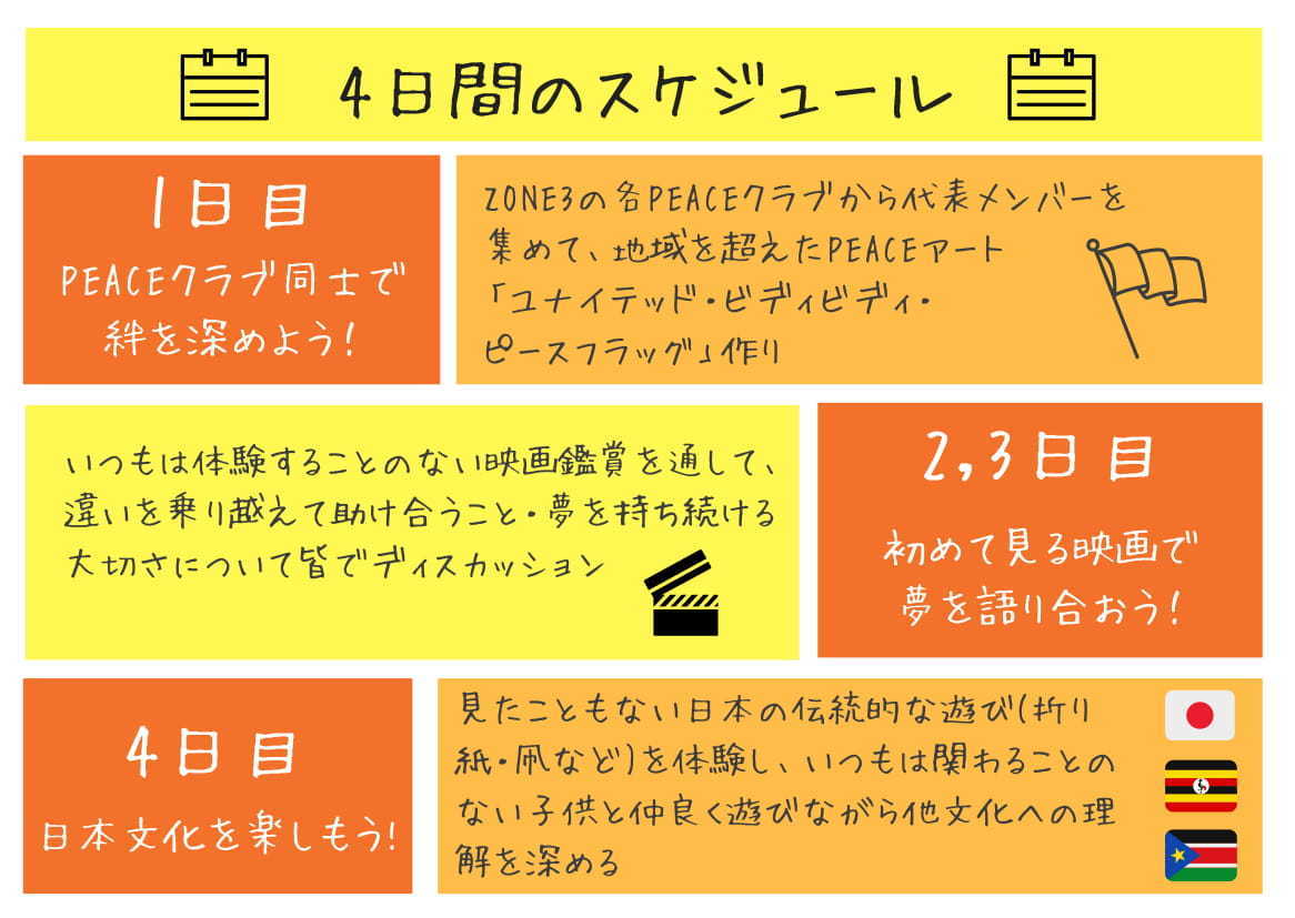 ZONE3で活動している6つの【PEACEクラブ】に焦点を当てて実践します。どのアクティビティも各【PEACEクラブ】から2名ずつ集まった12名の【PEACEクラブ】代表メンバーとともにイベントをリードし、【PEACEクラブ】の存在感を引き立てます。
