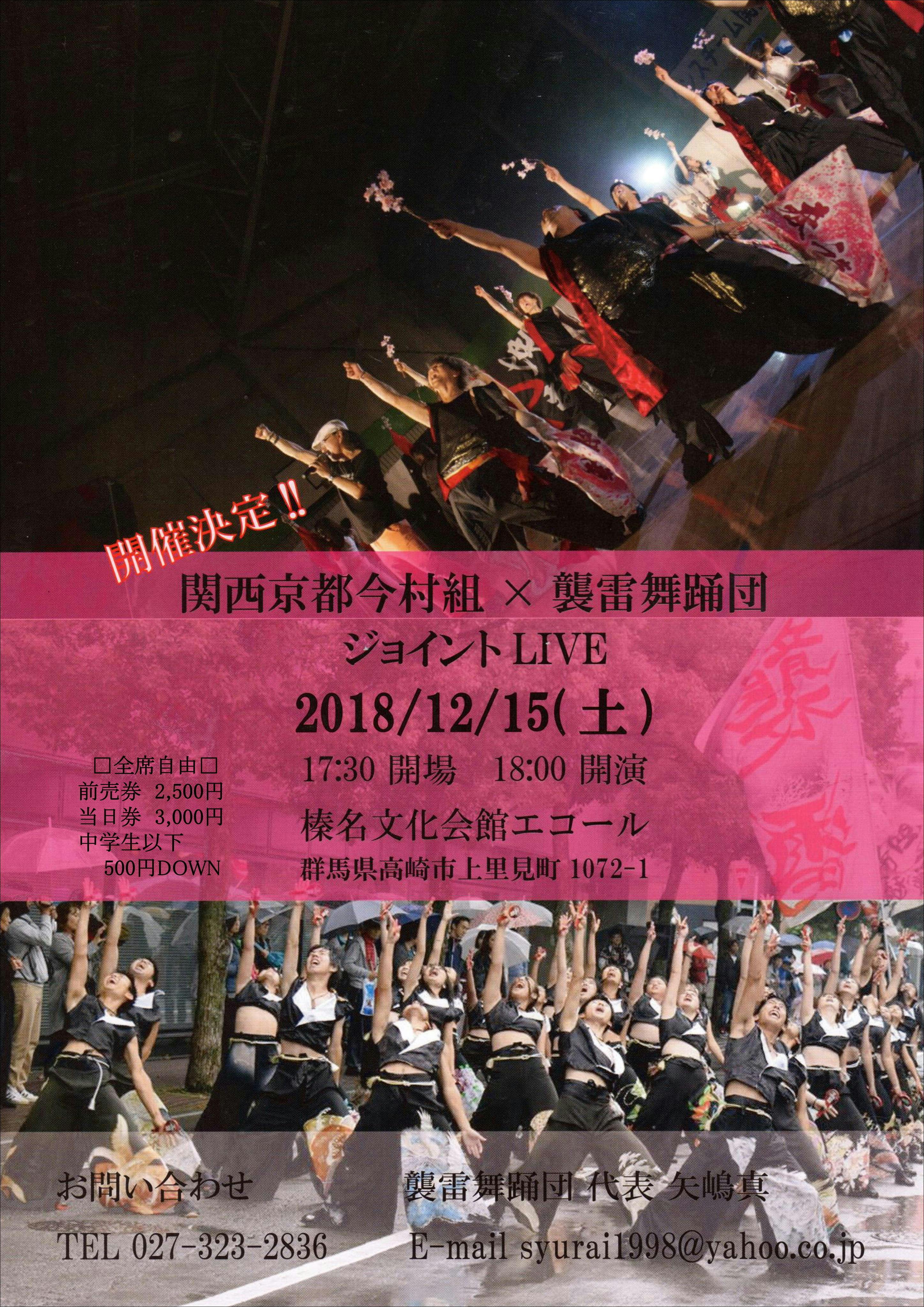 2018年12月15日、群馬県高崎市で、このプロジェクトの発起人の今村先生率いる『関西京都今村組』と、私達『襲雷舞踊団』でチャリティーライブを行います。