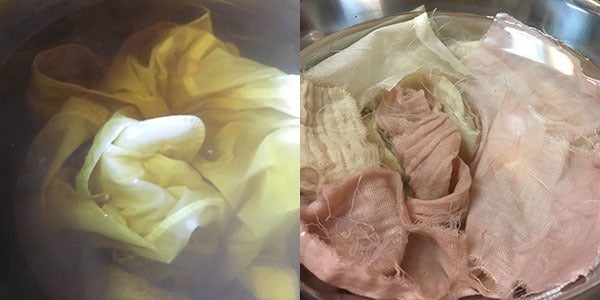 画像:左がユズの枝葉、右が桜の枝でテスト用のハギレを染めているところ。