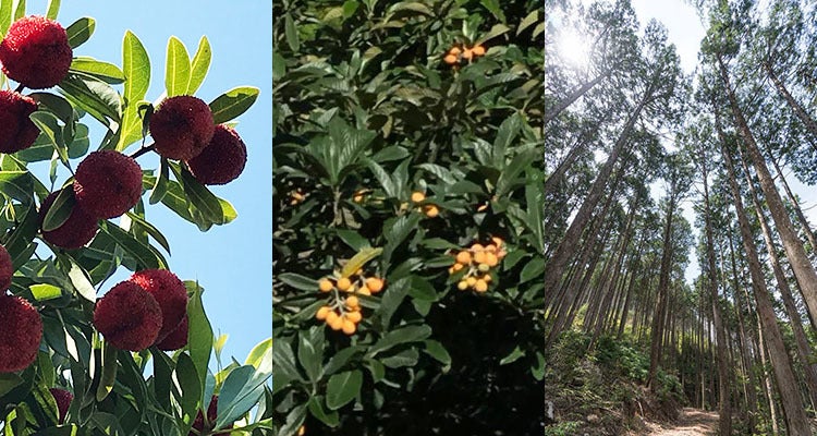 左からヤマモモ、ビワ、杉。高知県の県花に制定されているヤマモモは街路樹にもされていて、県民には花よりも甘酸っぱくて美味しい実の方が人気です。畑の脇などによく自生しているビワには様々な薬効があると言われ、葉を使ってベージュ~ピンクのやさしい色に染まります。そして森林面積率84%で日本一の高知県では、山を見渡すと必ずと言っていいほど目に入ってくる杉ですが、間伐材からも取れる樹皮や枝葉が使えます。