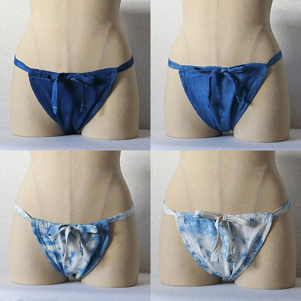 今回のリターン品のふんどしでは、上記の各仕様/サイズのふんどしに、室戸産藍の単色染めとムラ染めのいずれかの色を、1枚または複数枚のセットで選んでいただけます。
