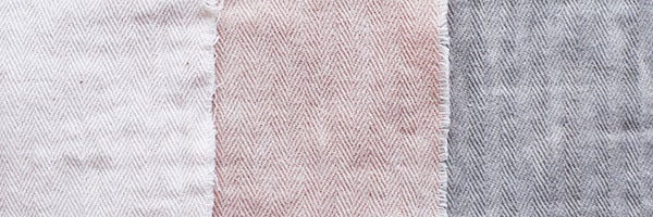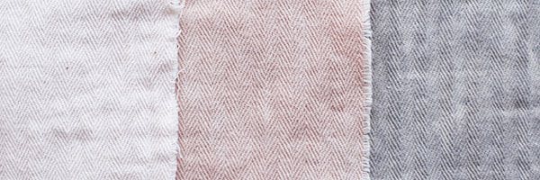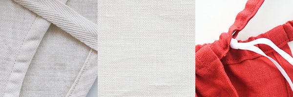 画像左:染色用の綿100%生地の表・裏・ひも、中:染色用の麻(リネン)100%生地、右:ゴムの調整交換口(当店レギュラー品)