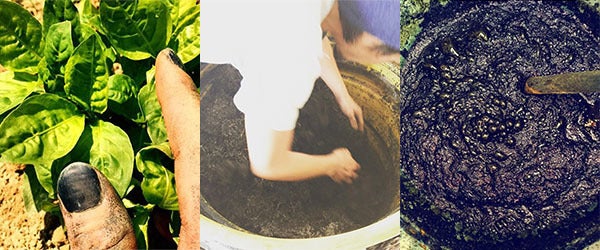 画像上:ワークショップの様子、下左から:藍の葉、すくも建てという発酵させる作業、藍の染液