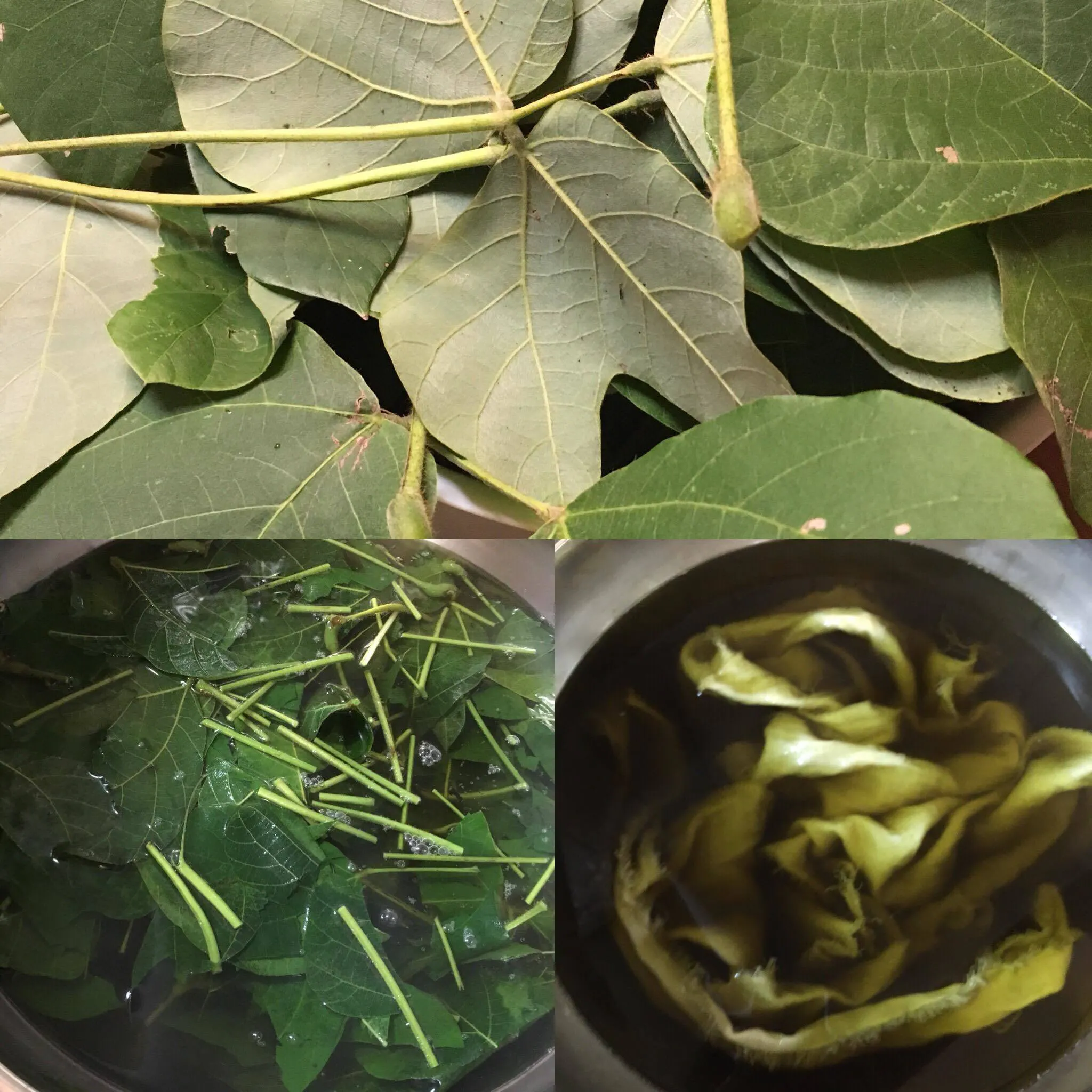 2018/09/19 22:10連日、みどりミドリした画像です(^^;)昨日の土佐市での打ち合わせの帰りに、仁淀川沿いの道路わきで葛をたくさん採ってきたので、今月3回目の葛での染めテストをしてます。 1回目:半日日陰の場所で採集。煮出し、染め①、媒染①(銅)、染め②、媒染②、染め③→グレーがかったごくうすい緑。イマイチ…△。 2回目:ほぼ1日中日陰の場所で採集。煮出し、染め①、媒染①(アルミ)、染め②、媒染②、染め③→淡いけどキレイな緑。いい感じ!この調子でもう少し濃く仕上がれば◎! 3回目(今日):1日中日向の場所で採集。煮出し、染め①、媒染①(アルミ)、染め②、媒染②、染め③(イマココ)。色味は2回目に近いけど、ごく淡ーい仕上がりになりそう。 2回目と3回目は同じ手順で作業してるのに、なぜだ? 採集場所の違い? 作業中に気付かなかった手順やの違い? 奥が深い!謎が謎を呼ぶ! でも楽しすぎる!! ってことで、昨日の葛は大量に採ってきたので、明日また葉の量を増やしてテストしてみて、仕上がった一連の生地の画像もアップしてみたいと思います! もっと見る