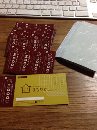 キャンプファイヤーで支援してくださった皆様へのリターンでご用意した宿泊チケットの封入作業中。